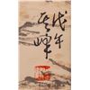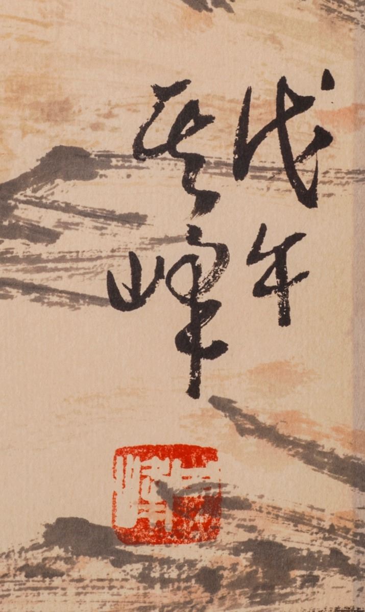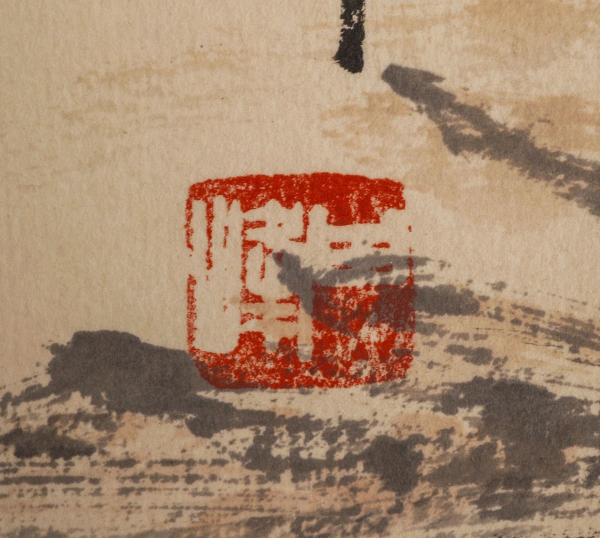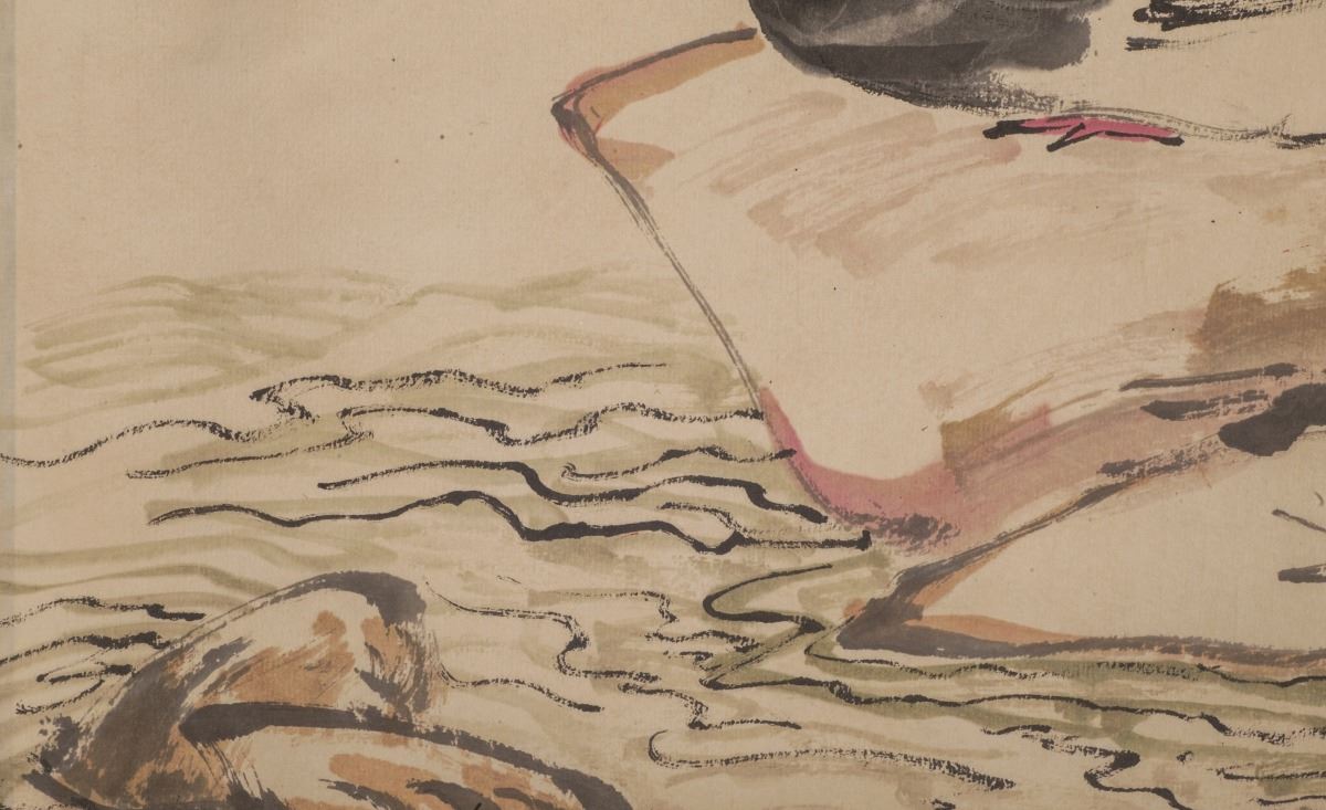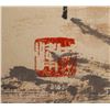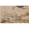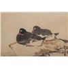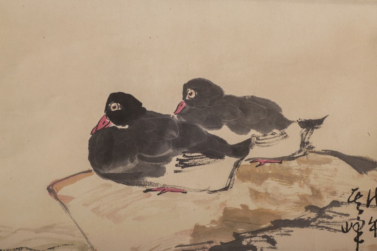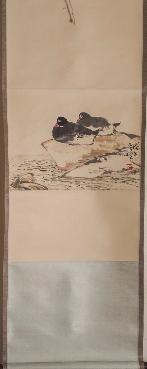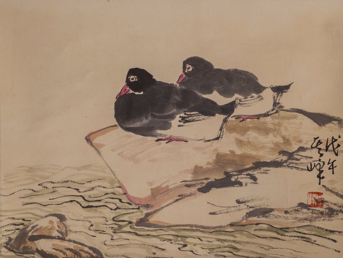 Vividly painted with two ducks, ink on paper. Both with grey feather on the rounded body, with red mouth and foot. All set within the rivers and rocks.