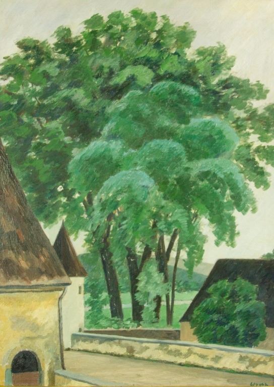 Landscape of a village and big trees; oil painting on canvas; framed; attributed to Andrew Wyeth (1917-2009); 71.5 cm × 53 cm