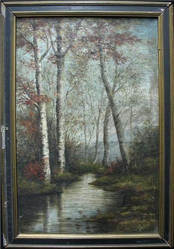 Attributed to Alex Wyant; American 1836-1892; oil on canvas woodland landscape with stream; image size 15" x 10" (overall crazing)