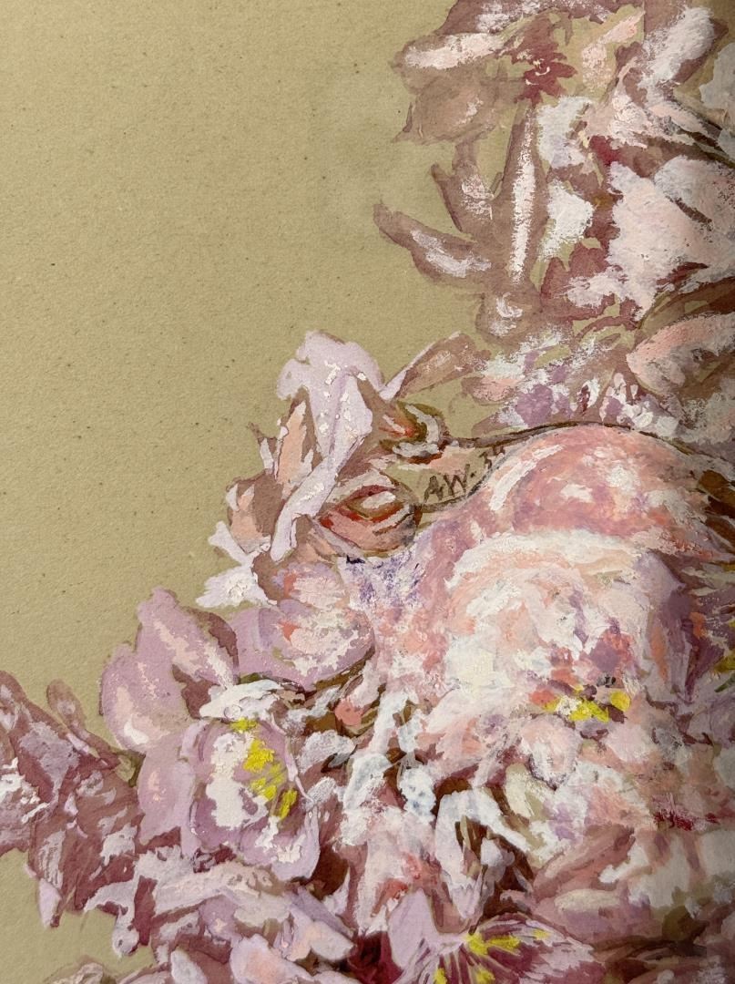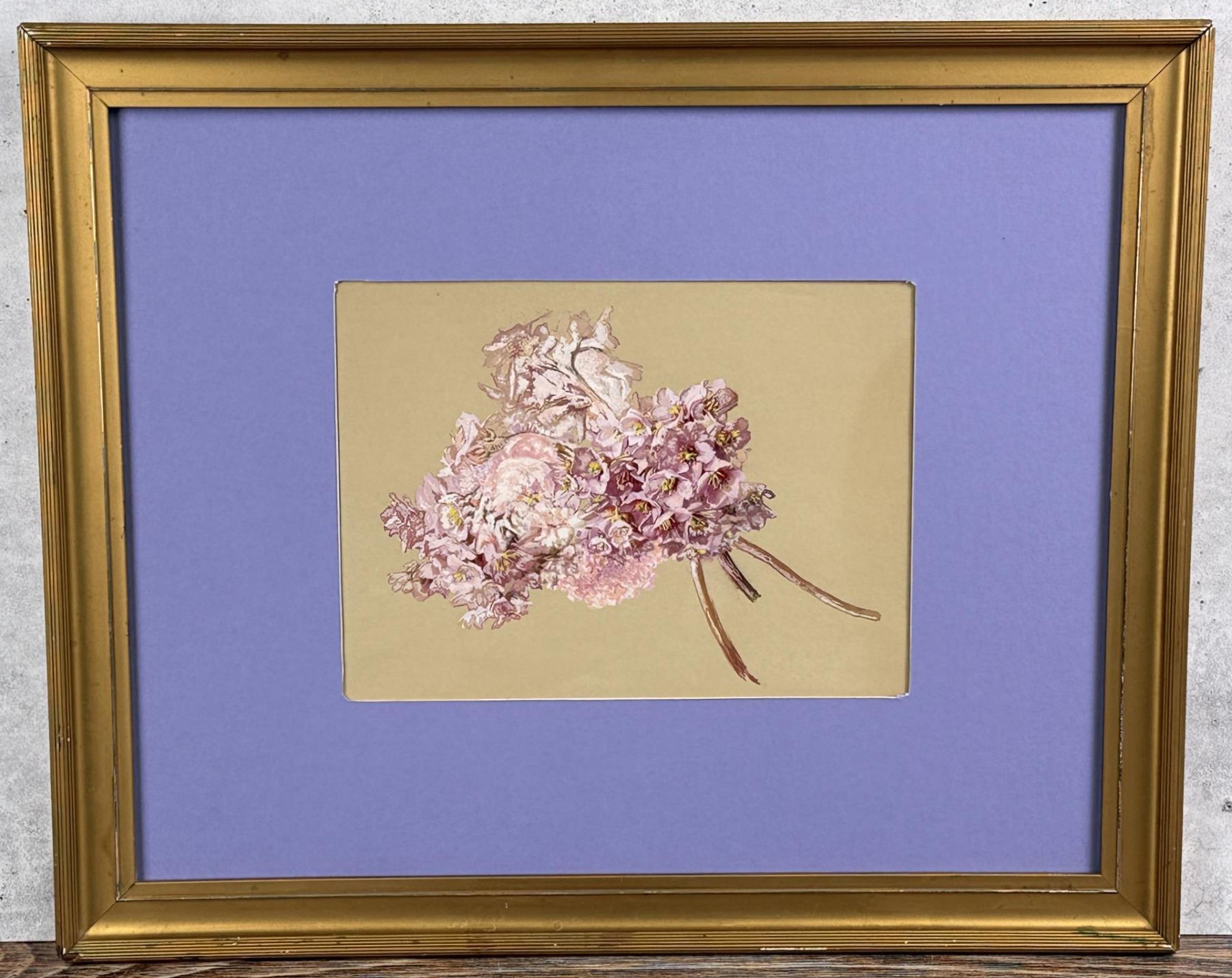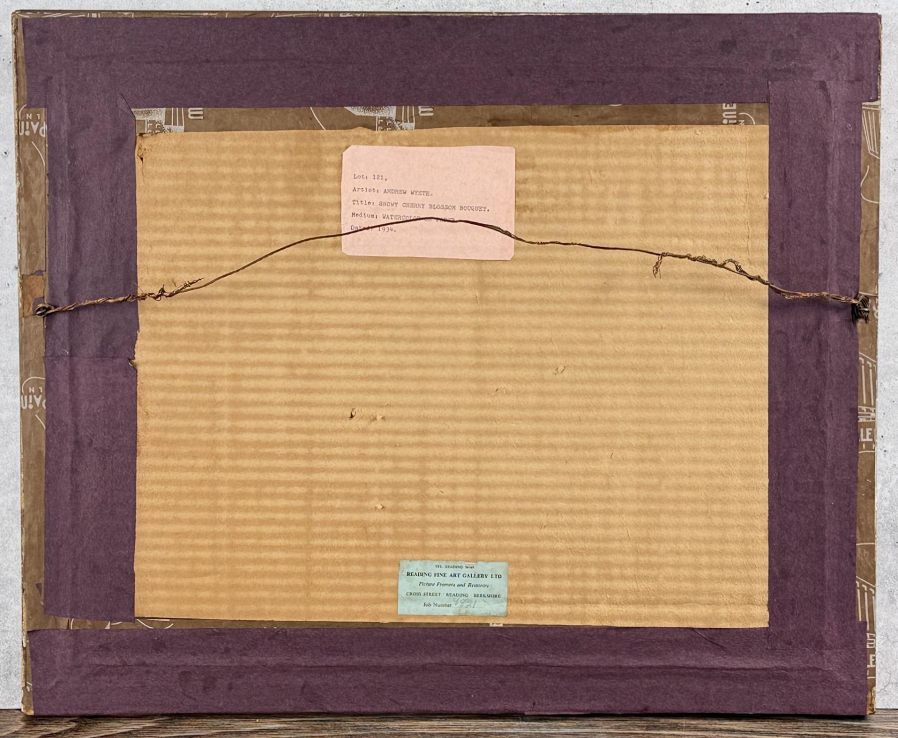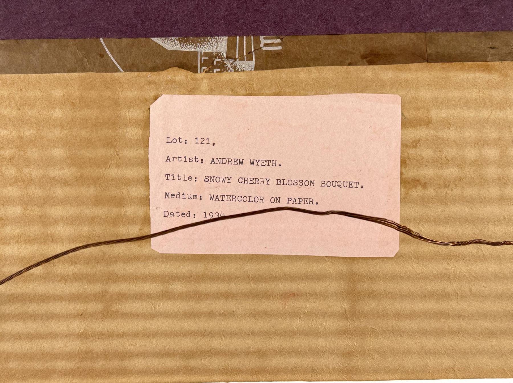 Title is Snowy Cherry Blossom Bouquet 1934. Gouache on Paper. 18 3/4" by 22 3/4" framed. 8 3/8" by 11 1/2" unframed. Notes: In our opinion this appears to be the work of Andrew Wyeth, however, as no catalogue raisonne entry is present, we are listing it as attributed to the artist. As of the catalog publish date, we have reached out to the Brandywine center and are awaiting a response. Provenance: The Estate of Larry Wade, Kansas. Old Auction tag on verso Stating Lot 121. Andrew Newell Wyeth (1917 - 2009) was active/lived in Pennsylvania, Maine. Andrew Wyeth is known for Figure, portrait, landscape and genre painting. A painter of landscape and figure subjects in Pennsylvania and Maine, Andrew Wyeth became one of the best-known American painters of the 20th century. His style is both realistic and abstract, and he works primarily in tempera and watercolor, often using the drybrush technique. He is the son of Newell Convers and Carolyn Bockius Wyeth of Chadds Ford, Pennsylvania, and was home-schooled because of delicate health. His art instruction came from his famous-illustrator father, who preached the tying of painting to life--to mood and to essences and to capturing the subtleties of changing light and shadows. The Wyeth household was a lively place with much intellectual and social stimulation. Because of the prominence of N.C. Wyeth, persons including many dignitaries came from all over the country to visit the family. Andrew's sisters Carolyn and Henriette became noted artists as did his brother-in-law, Peter Hurd. The non-art oriented brother, Nathaniel Wyeth, achieved much success as a chemist for DuPont where, among many inventions, he created a durable plastic so plastic bottles could hold carbonated beverages. Andrew Wyeth maintained a style strongly oriented towards Realism when Abstract Expressionism was all-prevalent. Adhering to his own path, he was snubbed by many prominent art critics. However, his paintings have elements of abstraction in that the work derives from his strong feelings about his subjects, which often appear in unusual positions, juxtapositions, and with features highlighted for emotional effect. His work usually suggests rural quiet, isolation, and somber mood and is devoid of modern-day objects such as automobiles. In 1937, Wyeth's first one-man show of watercolors depicting scenes around Port Clyde, Maine, sold out at the Macbeth Gallery in New York. In Maine, Andrew first spent his summers in Port Clyde with his family, but after his marriage to Betsy James in 1940, he and his wife went regularly to Cushing. Christina Olson of Cushing, at the end of Hathorn Point, was his most famous model, but over the years, Wyeth formed close friendships with - and painted - several other Maine neighbors. His closest friend, Walt Anderson, gradually ages before the eyes of viewers in numerous Wyeth drawings and paintings that show life's changes from the youthful Young Swede (1939) to the older man in Adrift (1982). The Olson House, where Christina and her brother lived, is now owned and maintained by the Farnsworth Museum, where Wyeth had his first major exhibition in 1951 and where the Andrew Wyeth Gallery is now a permanent exhibition place for his paintings. In 1964, the directors of the Farnsworth Museum paid $65,000 for Wyeth's painting Her Room, the highest price ever paid by a museum for the work of a living artist. The Olson House is the first property ever named to the National Register of Historic Places for being recognized as the site of a painting, Christina's World, one of the most recognized paintings in American art. After the death of Christina Olson, Wyeth used female models Siri Erickson of Cushing, and Helga Testorf of Chadds Ford. Depictions of the nude Helga, a total of 240 works, provided grist for an avalanche of sensational publicity. The Helga paintings were exhibited in 1987 at the National Gallery of Art, the gallery's first exhibition of works by a living artist. Wyeth has received many official honors. In 1963, he was the subject of a cover story for Time magazine and, thanks to President John F. Kennedy, he became the first visual artist to be nominated for the Presidential Medal of Freedom. In 1990, Wyeth received the Congressional Gold Medal, the first artist to have that honor. Andrew and his wife Betsy have two sons, Nicholas and Jamie Browning, the latter who has become a prominent American artist, and the former who shares with his father and his uncle, Nathaniel, a great fascination with machines, especially aviation.