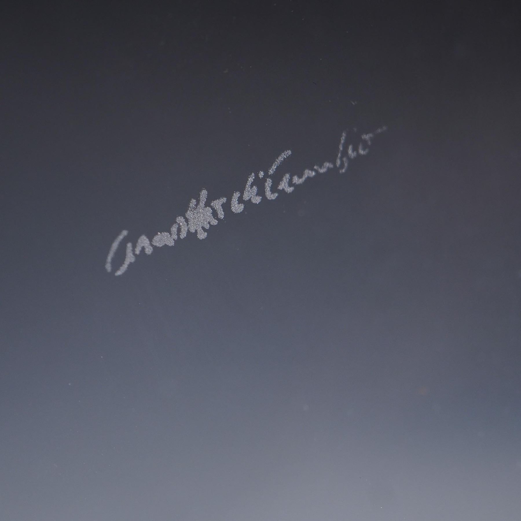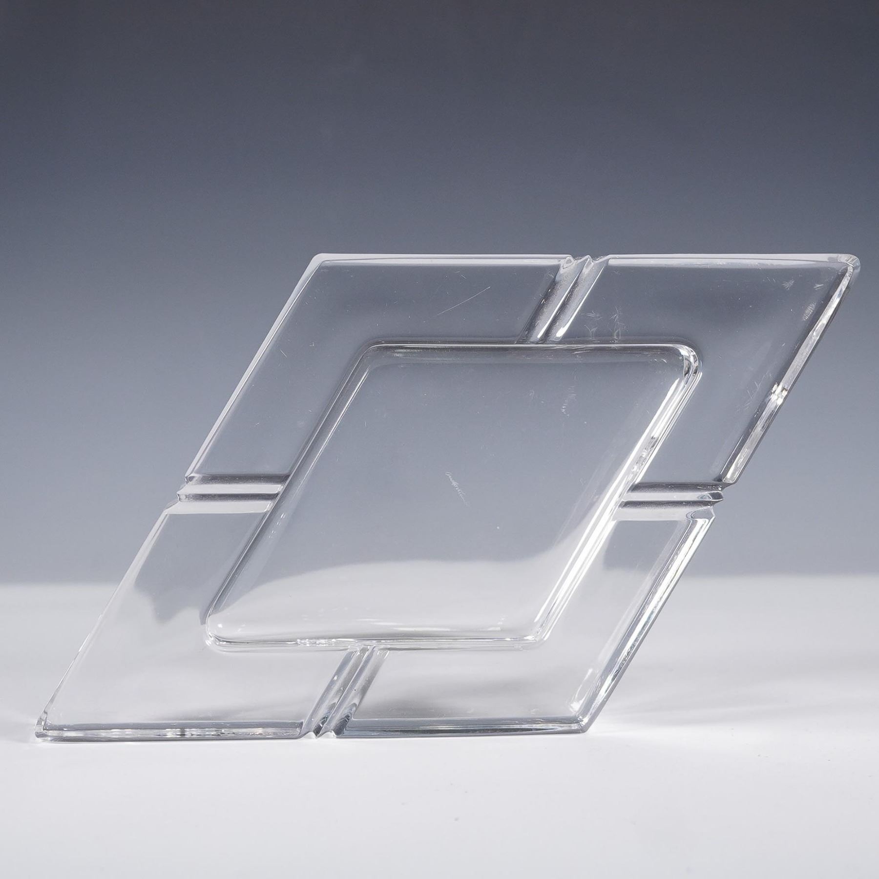 Contemporary crystal tray in a bold geometric design, attributed to Arnolfo di Cambio. The piece features an interlocking diamond motif in clear cut crystal, showcasing refined lines and high-quality craftsmanship consistent with Italian modernist glassware. An acid-etched signature appears on the underside and seems to read Arnolfo di Cambio, though it differs from the commonly seen block-letter font. This variation may indicate a different production era or a designer-specific mark; however, the attribution cannot be confirmed with certainty. A sculptural piece that functions beautifully as a centerpiece or decorative tray.
