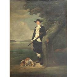Attributed to Arthur Devis (1711-1787), oil on canvas, portrait of a gentleman standing with two dogs, in a landscape, 24ins. x 18ins. (see illustration) £2000-3000