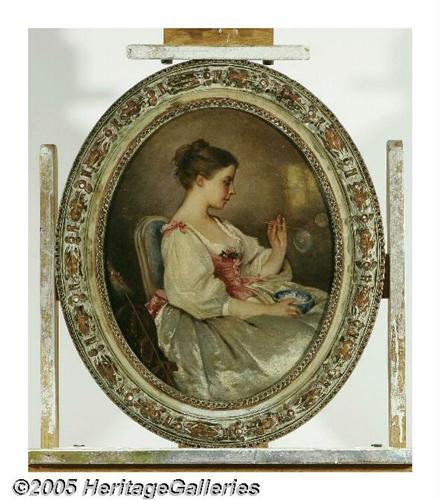 <B>Attributed to CHARLES CHAPLIN (French 1825- 1891)</B></I><BR>Blowing Bubbles<BR>Oil on canvas laid down on board<BR>16.5in. x 13.25in. (oval)<BR>Provenance: Collection of Major Edward Bowes, sold at Parke Bernet Galleries, New York, February, 1944<BR><BR>Condition report: Canvas laid down on board, abrasion around edges, small triangular area of loss on lower left edge, cracks lower left with losses<BR>