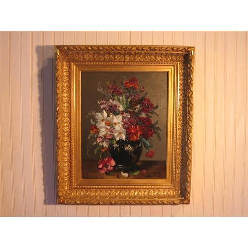 Accomplishments: Member of the Société des Artistes Français. Studied under Ferdinand Duboc. His still life florals found a wide audience among collectors both during the late nineteenth century and into the twenty-first century. Cauchois? still lifes reflect a strong influence from the great Impressionist artists of his time. His numerous works of art are painted layer upon layer with loose and fluid brush strokes delivering soft, colorful and lustrous imagery. In the mid 1890?s Cauchois began studying under Alexandre Cabanel, one of the most successful academic artists of the period. As an understudy of Ernest Quost in the late 1800's, Cauchois began to work more and more on decorative panels. He received several commissions for his larger works. This piece is signed (lower right) in what we believe is one of Cauchois' pseudo-names. It is housed in an older frame though not original to the piece. It is on its original stretcher with no damage, restorations or relining. This is a stunning piece of art. Canvas measures 15"h x 12.5"w