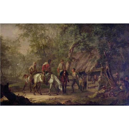 Dutch [1753-1816] HUNTING PARTY AT A STABLE oil on panel 15.75 x 24 in. (40 x 61 cm) signed & dated indistinctly