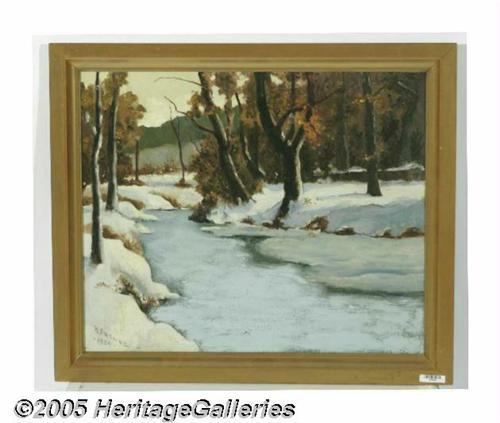 <B>Attributed to HANNY (HANNI) FRANKE (German 1890 - 1973)</B></I><BR>Winter Stream, 1939<BR>Oil on canvas<BR>20in. 24in.<BR>Signed and dated lower left<BR><BR>Condition Report: Unlined original canvas, surface abrasions in water, overall yellowed old varnish<BR>