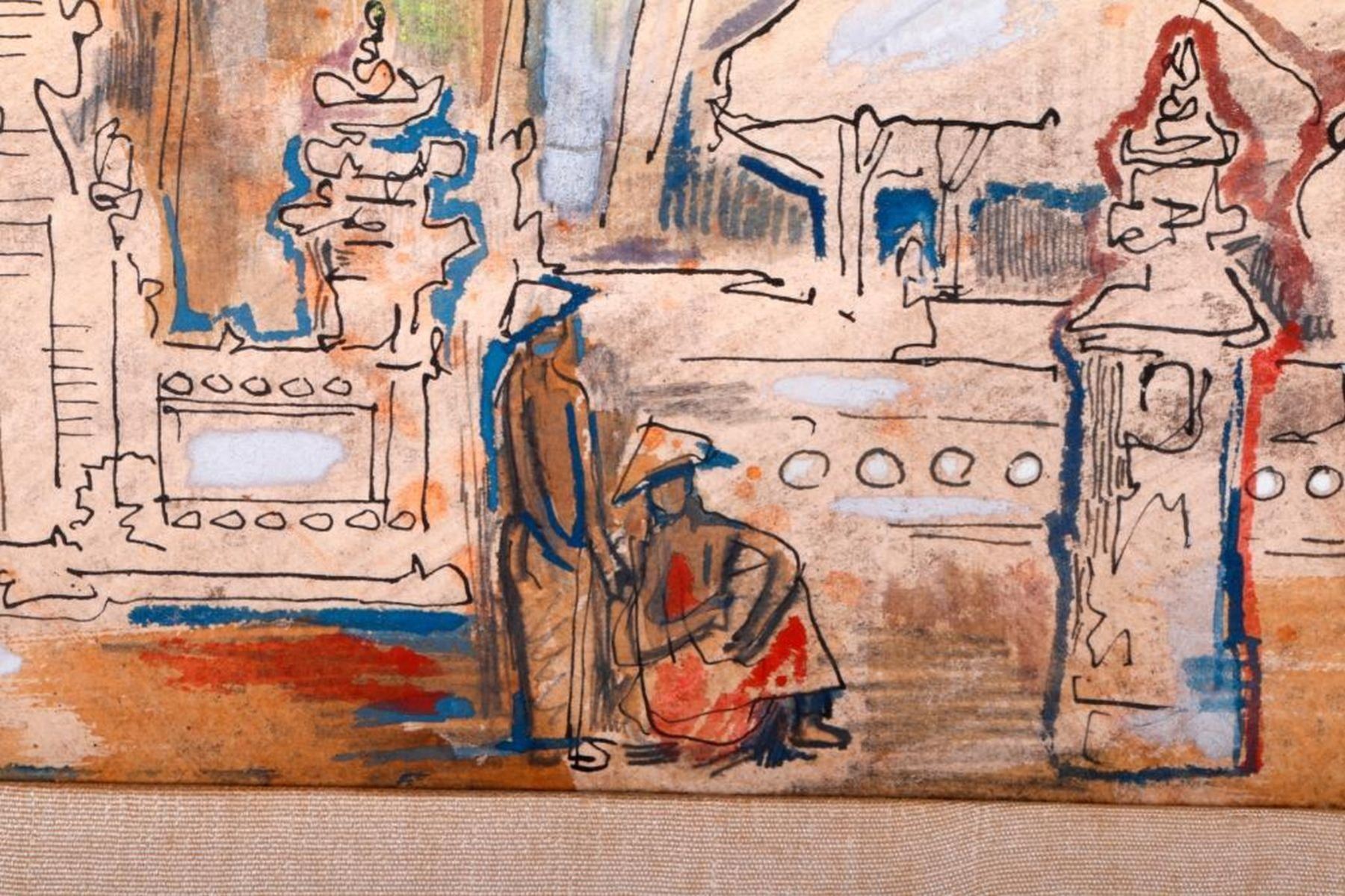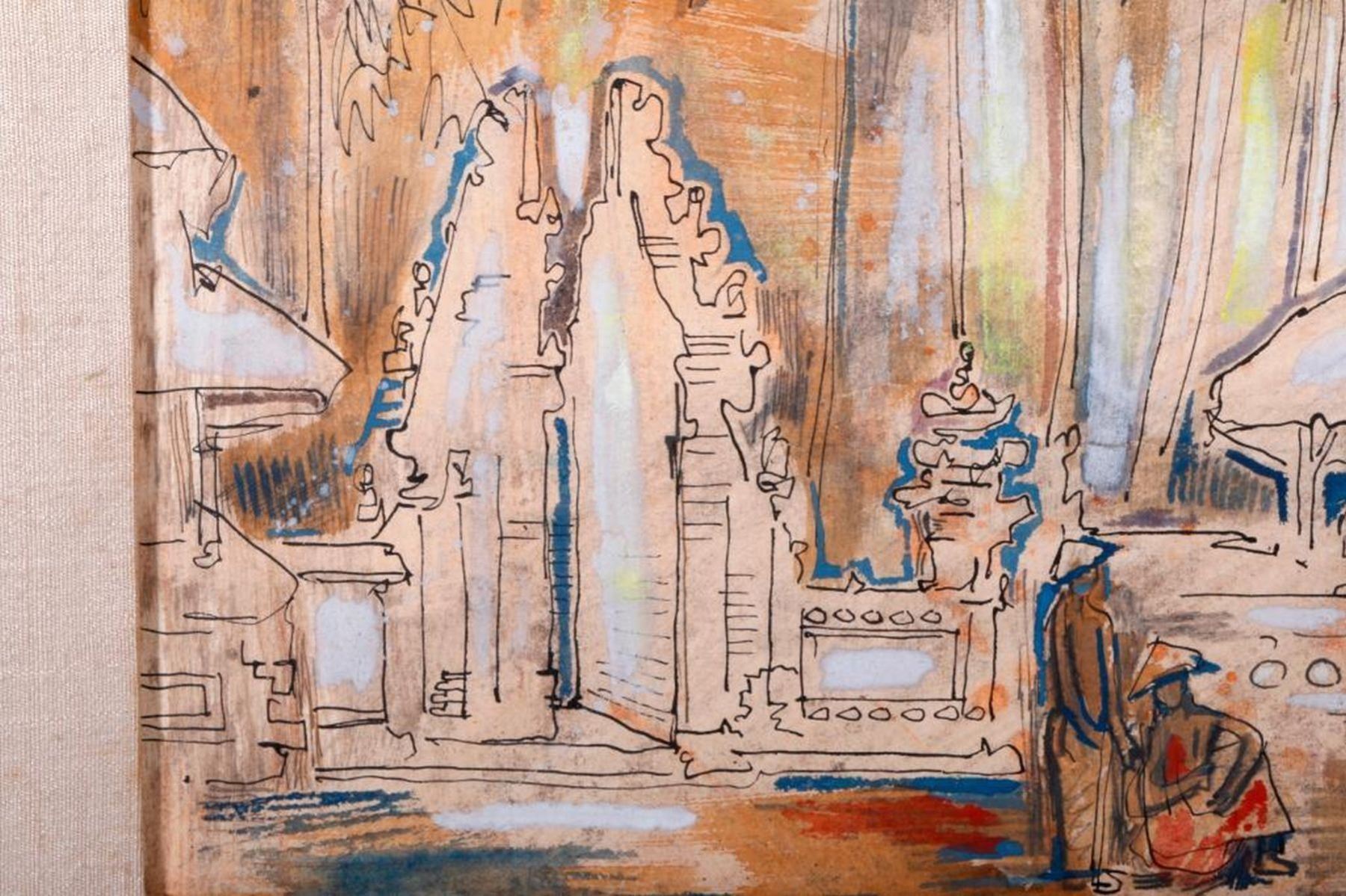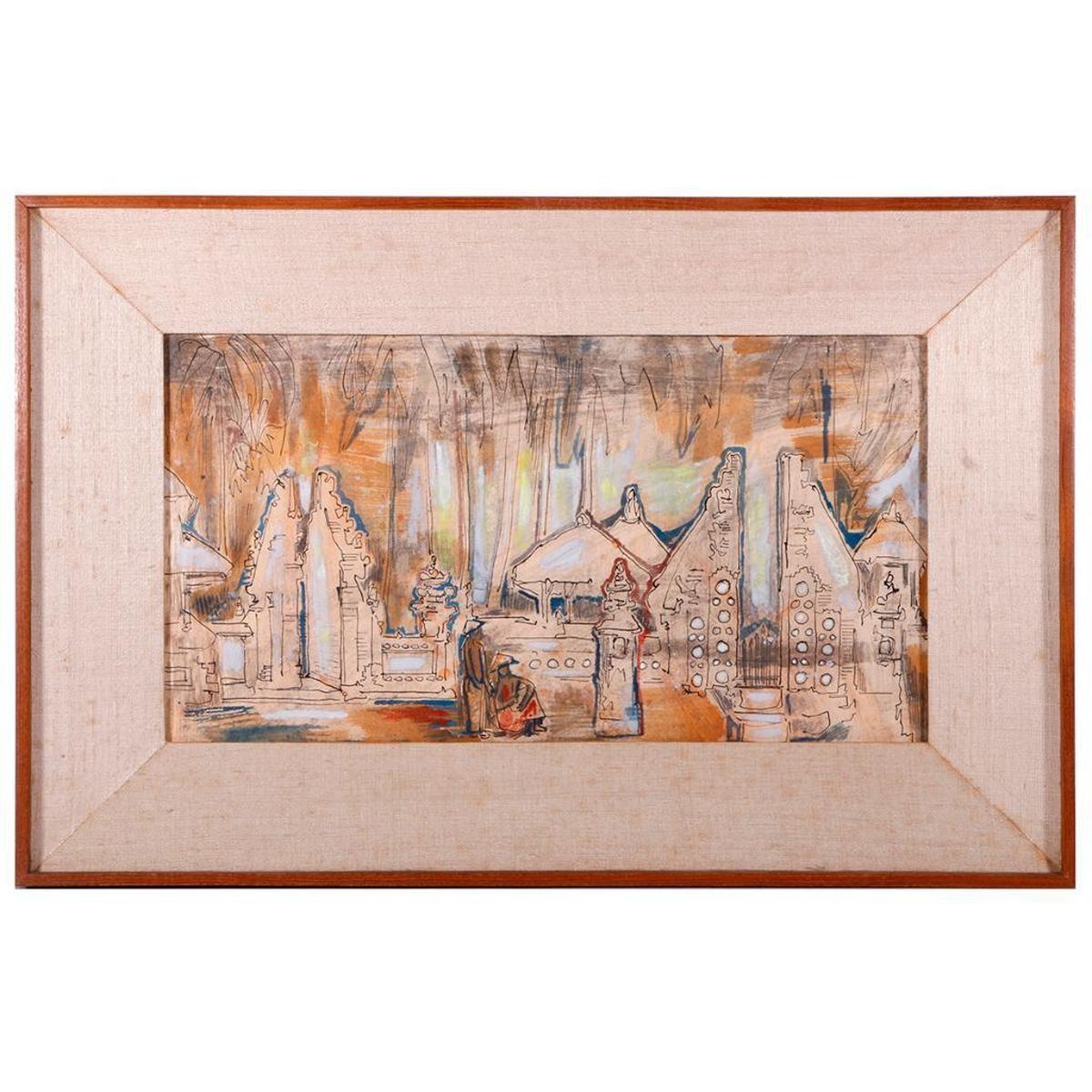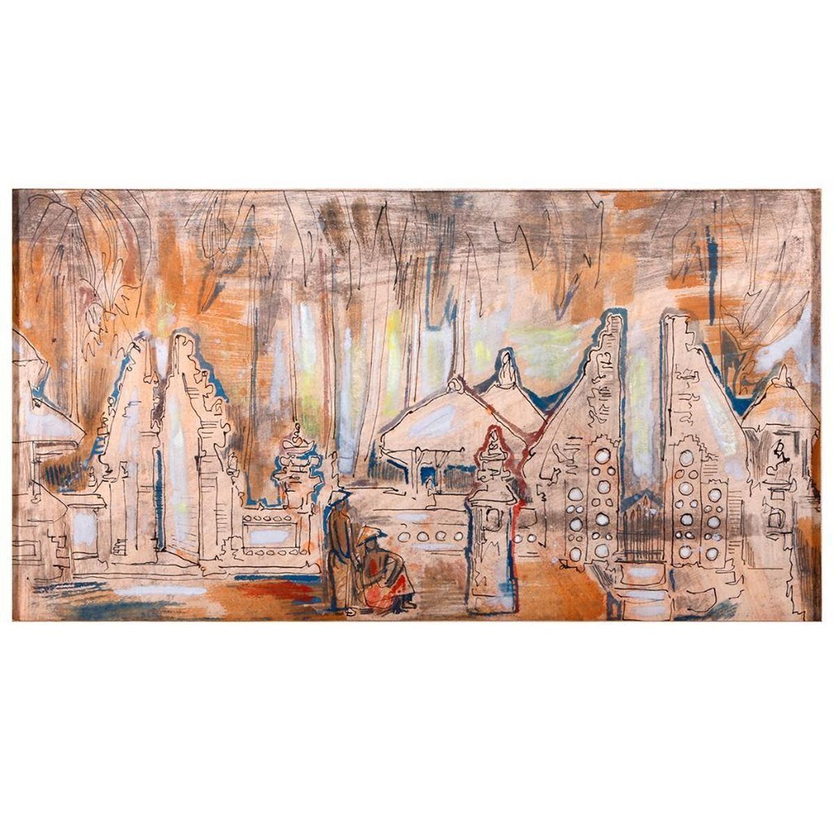 Artist: Attributed to Hans Snel (1925 - 1998). Title/Subject: Balanese Temple scene. Date: 1963. Medium: Ink and pastel on board. Size Image: 10 inches high x 17 1/2. Size Frame: 15 inches high x 23. Condition: Good.