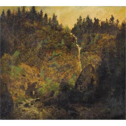 <B>Attributed to HERMAN HERZOG (German/American, 1831-1932)</B></I><BR><I>Mountain Landscape with Waterfall</B></I><BR>Oil on composite board<BR>12-1/2 x 14 inches (31.8 x 35.6 cm)<BR>Signed lower right: <I>H. Herzog</B></I><BR> <B>Condition Report:</B> Framed, slight damage to lower left corner, surface grime, otherwise good condition. <BR><BR><b>Shipping:</b> Framed - without Glass, Small (<a target="_blank" href="http://www.heritageauctions.com/common/shipping.php">view shipping information</a>)