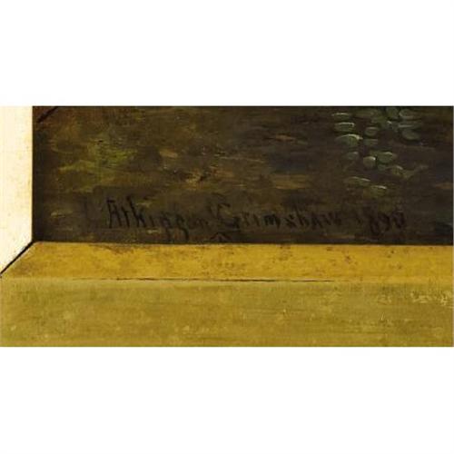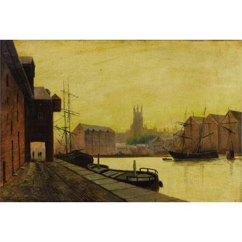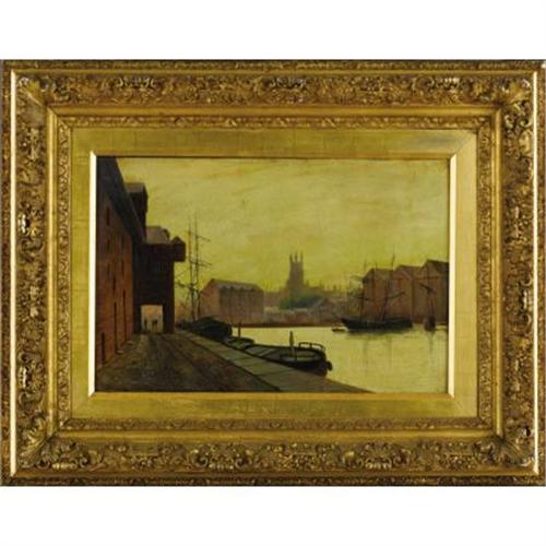 <B>Attributed to JOHN ATKINSON GRIMSHAW </B></I>(British 1836-1893)<BR><I>Gloucester Dock</B></I>, 1890<BR>Oil on canvas<BR>12 x 18 inches (30.5 x 45.7 cm)<BR>Signed lower left [strengthened]: <I>Atkinson Grimshaw 1890</B></I><BR>Signed, titled and dated on verso<BR> <BR>John Atkinson Grimshaw scholar, Alexander Robertson, has kindly examined the present work from photographs, and has noted that it is one of five versions of this subject known to him, one of which he rejected as an autograph work by the artist some years ago. While he noted that from photographs alone he was unable to give a definitive opinion on this painting's authorship, Mr. Robertson offered the following observations in email correspondence with Heritage on October 28, 2007: "What struck me immediately about the present painting is that the signature has been ‘gone over,‘ which is unusual but has been seen on other Grimshaws when someone has wished to change the attribution to Atkinson from his son Arthur's name. Having said this, however, the underlying name does seem to be Atkinson. The top version is a crude attempt to imitate the artist's usual way of signing. Various other parts of this work are unconvincing especially the cathedral tower which seems very wobbly! Also I do not like the various highlight effects on the end of the barge in rather crude green paint. Of course there is the possibility that this was an unfinished picture left lying around and someone else finished it later." <BR><BR>John Atkinson Grimshaw was a later nineteenth-century British landscape painter who worked in a meticulous manner associated with Pre-Raphaelite painting. He was born in Leeds into modest circumstances and to parents who were strict Baptists. His mother so strongly disapproved of his interest in painting that on one occasion she destroyed all his paints. Despite the resistance of his family, Grimshaw, who worked as a clerk at the Great Northern Railway office in Leeds, eventually decided to become a full-time painter in 1861. He first became popular in Leeds, working initially as a figurative painter (a la Holman Hunt, one of his earliest inspirations), then as a still-life painter, and later specialized in moonlit scenes along the Thames and other waterways, and narrow city streets illuminated by gaslight as well. When William Agnew became his dealer in London, Grimshaw's fortunes changed. By 1870 he was in a position to buy Knostrop Old Hall, a large seventeenth-century manor house two miles from Leeds. There, he and his wife Fanny had fifteen children although only six reached adulthood. <BR><BR>Grimshaw was a major force in establishing the Leeds City Art Gallery. He campaigned for it vigorously since it was first suggested by Edmund Bates in 1862, and after a long struggle it was eventually opened in 1888. The Gallery mounted annual spring exhibitions in which Grimshaw was always represented. <BR><BR>We are grateful to Alexander Robertson, former Senior Curator at Leeds City Art Gallery, for his kind assistance in cataloguing this lot. He is the author of <I>Atkinson Grimshaw 1836-1893</B></I>, exh. cat. Leeds, Southampton and Liverpool, 1980, and <I>Atkinson Grimshaw</B></I>, Phaidon, Oxford, 1988. <B>Condition Report:</B> Original canvas<BR><BR><b>Shipping:</b> Requires 3rd Party Shipping (<a target="_blank" href="http://www.heritageauctions.com/common/shipping.php">view shipping information</a>)