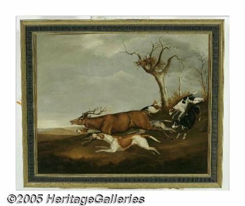 <B>Attributed to JOHN FERNELEY JR. (British 1781-1860)</B></I><BR>The Stag Hunt<BR>Oil on canvas<BR>24.5in. x 30in.<BR>Signed 'John Ferneley' lower right<BR><BR>Condition Report: Canvas appears to have old lining, extensive light overpaint throughout sky, significant inpainting in dogs at right of canvas and back of elk, substantial overpaint along bottom edge and across lower area, small scuff with lifting in center sky area<BR>