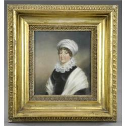 Attributed to James Sharples (1752 - 1811), Portrait Of Mrs. John Corbet (nee Anne Pigott of Sundorne Castle, Shrewsbury), seated, wearing a white turban, pearls and black velvet dress with lace ruffle, a white cape over her shoulders, pastel, 6.5in x 6in