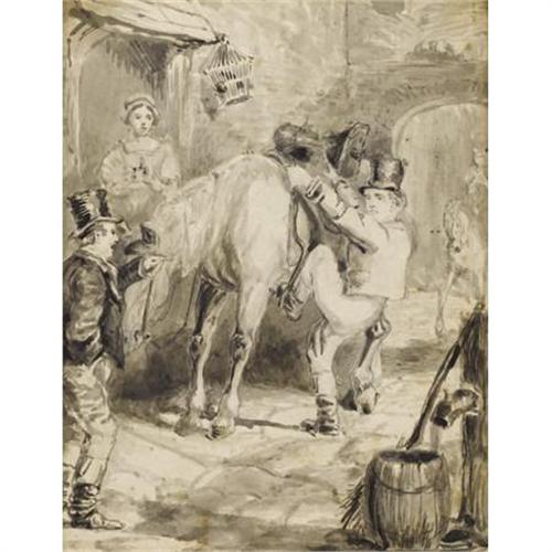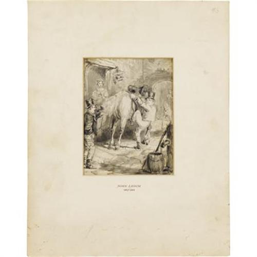 <B>Attributed to JOHN LEECH </B></I>(British 1817-1864)<BR><I>Outside the Tavern</B></I>, 19th century<BR>Pen and ink on paper<BR>6-1/2 x 5 inches (16.5 x 12.7 cm)<BR>Unsigned<BR> <B>Condition Report:</B> <BR><BR><b>Shipping:</b> Requires 3rd Party Shipping (<a target="_blank" href="http://www.heritageauctions.com/common/shipping.php">view shipping information</a>)