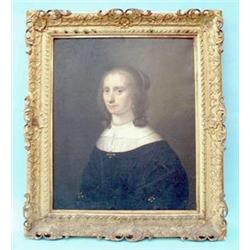 Attributed to John de Critz (circa 1555 - circa 1640) - oil on canvas, painting of a lady, reputed to be Agnes Brudinel, wearing a black dress, white collar, a pearl necklace and drop earring, half length, 28ins x 23ins, acanthus decorated giltwood frame (See illustration). £1000-1500