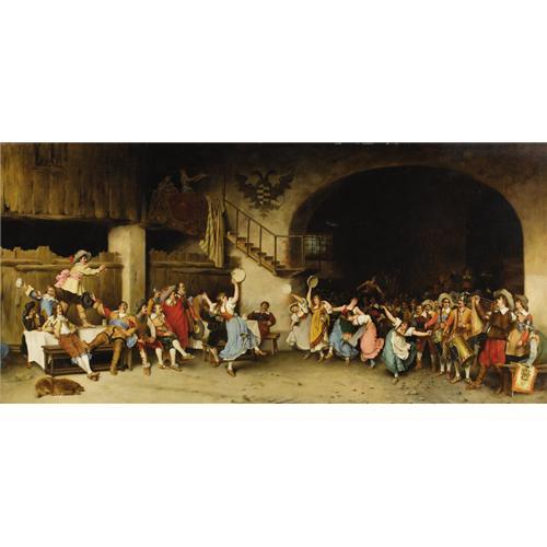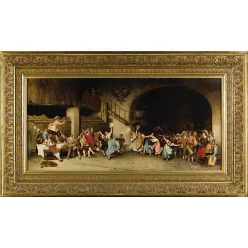 <B>Attributed to LUDOVICO MARCHETTI</B></I> (Italian 1853-1909)<BR><I>Peasant Dance</B></I><BR>Oil on canvas<BR>20-1/2 x 42-1/4 inches (52.1 x 107.3 cm)<BR>Unsigned<BR><BR> <B>Condition Report:</B> relined, strengthening to upper right margin, area near the two figures at the top of the stairs and one verticle line in lower left margin<BR><BR><b>Shipping:</b> Requires 3rd Party Shipping (<a target="_blank" href="http://www.heritageauctions.com/common/shipping.php">view shipping information</a>)