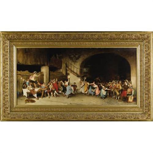 <B>Attributed to LUDOVICO MARCHETTI</B></I> (Italian 1853-1909)<BR><I>Peasant Dance</B></I><BR>Oil on canvas<BR>20-1/2 x 42-1/4 inches (52.1 x 107.3 cm)<BR>Unsigned<B>Condition Report:</B> relined, strengthening to upper right margin, area near the two figures at the top of the stairs and one verticle line in lower left margin<BR><BR><b>Shipping:</b> Requires 3rd Party Shipping (<a target="_blank" href="http://www.heritageauctions.com/common/shipping.php">view shipping information</a>)