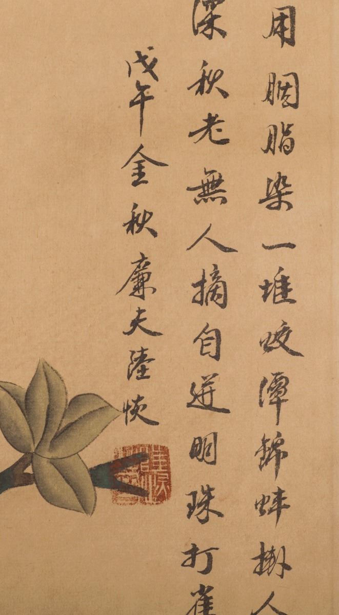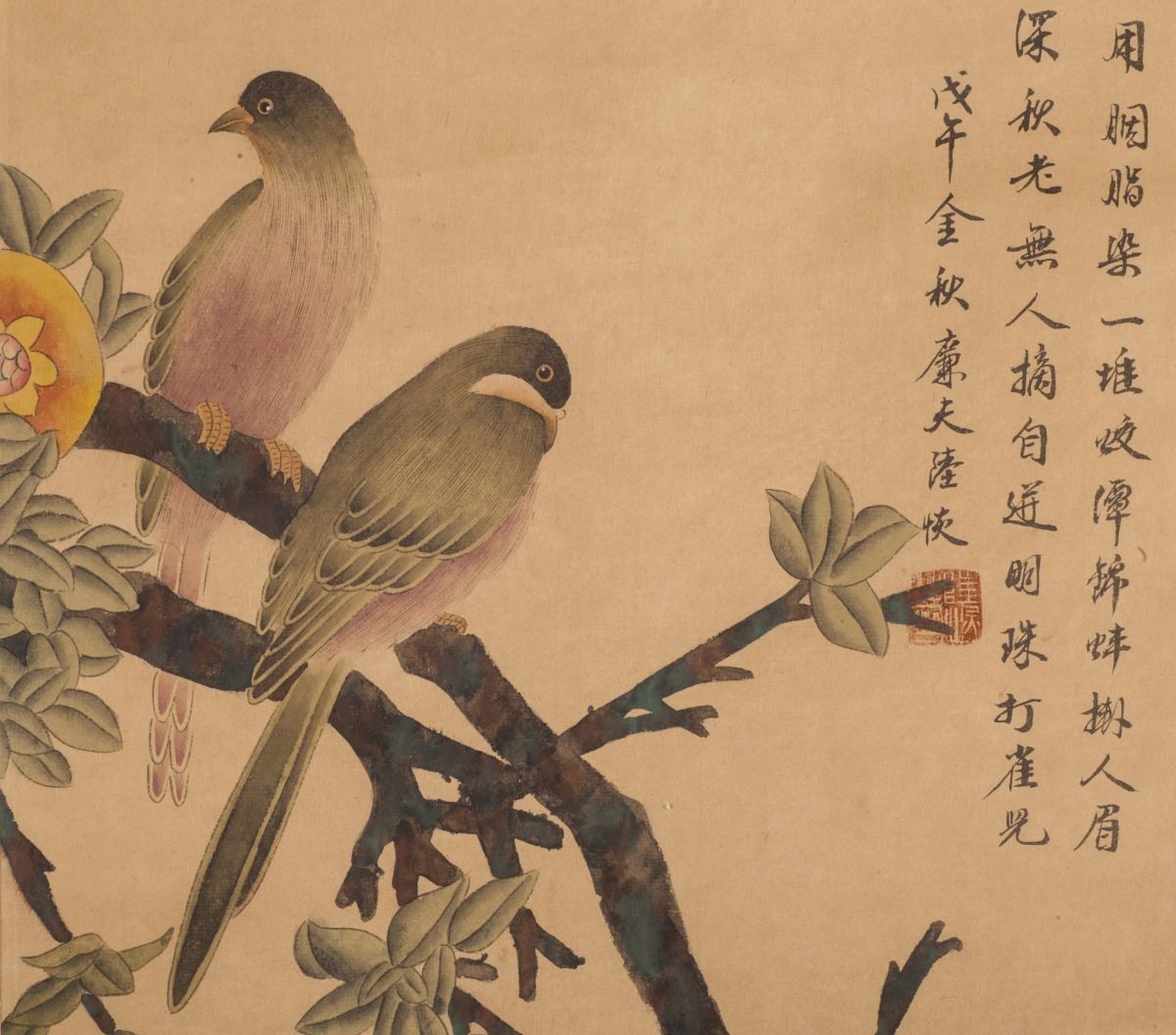 The Fully Grown Pomegranate, Designed In Extremely Detailed. With Two Delicate Painted Green Birds Standing On Branch. With Fine Calligraphy On The Top Right Corner.