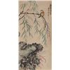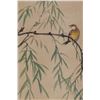 Watercolor And Ink On Paper. Vividly Painted With A Yellow Bird Standing On The Willow Branch. The Green Leaves Vividly Expressed. All Set Within The Rocks And Landscaping.