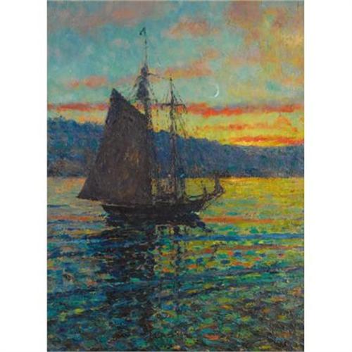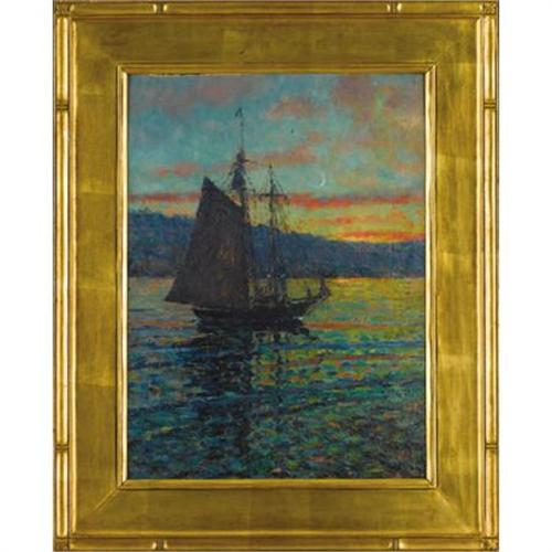 <B>Attributed to MARY LOUISE FAIRCHILD (American, 1866-1946)</B></I><BR><I>Sailboat at Dusk</B></I><BR>Oil on canvas laid on board<BR>20 x 15 inches (50.8 x 38.1 cm)<BR> <BR>PROVENANCE:<BR>Mary Louise Fairchild MacMonnies Low;<BR>Thence by descent to the present owner.<BR><B>Condition Report:</B> Re-varnished, minor scattered spots of in-painting and areas along the water bank, minior scuff mark in the upper right corner, craquelure.<BR><BR><b>Shipping:</b> Requires 3rd Party Shipping (<a target="_blank" href="http://www.heritageauctions.com/common/shipping.php">view shipping information</a>)