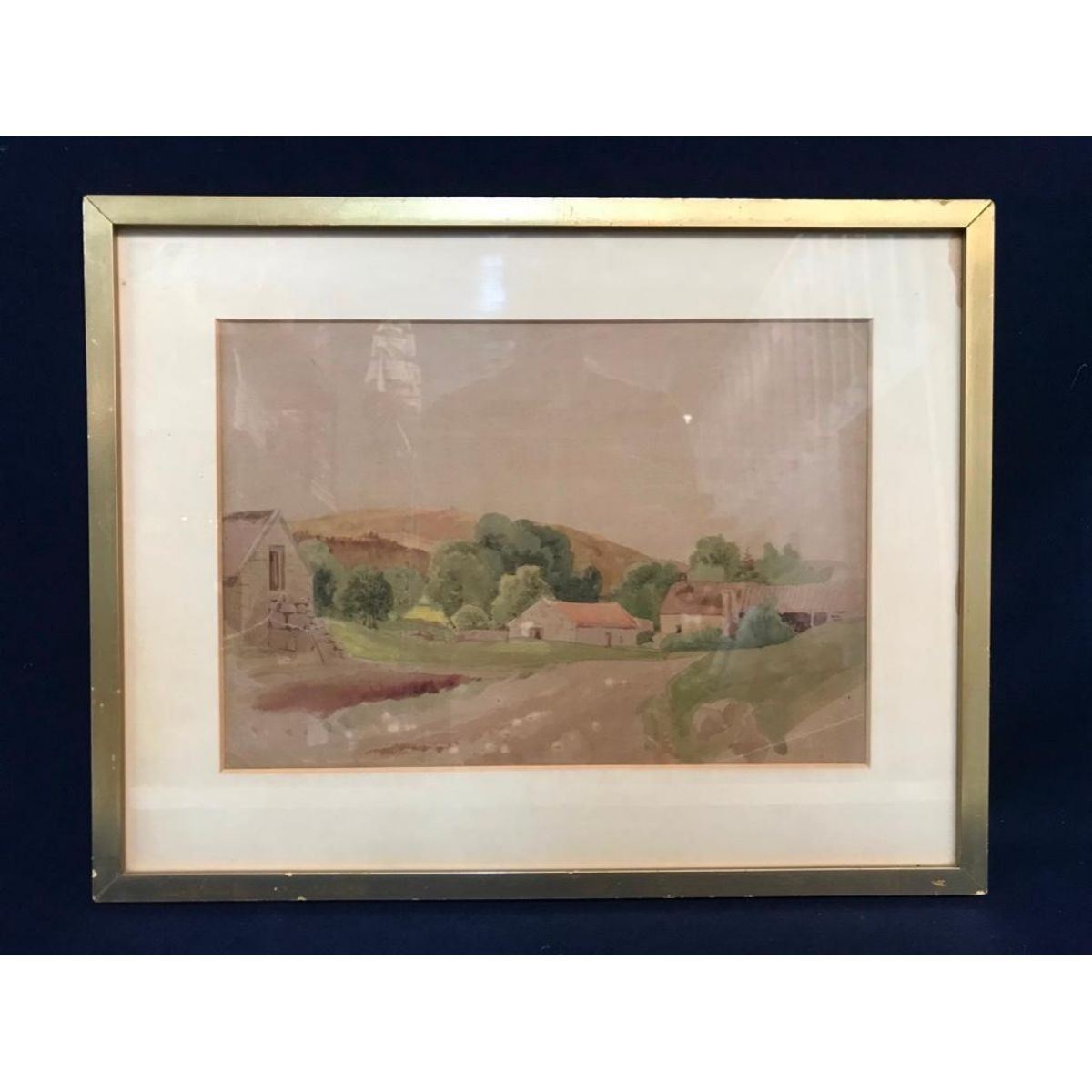 Attributed to John Middleton, 19th Century watercolor painting, landscape scene with barns, outbuildings. Under glass in 14 1/2" X 19" gilt frame.  John Middleton (9 January 1827 – 11 November 1856) was an English artist known for his accomplished watercolor paintings. He was the youngest and the last important member of the Norwich School of painters, which was the first provincial art movement in Britain. As well as being a talented etcher, he produced oil paintings and was an enthusiastic amateur photographer. Member of the Royal Academy.