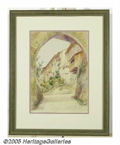 <B>Attributed to NEWELL CONVERS WYETH (American 1882- 1945)</B></I><BR>Sunlit Village<BR>Watercolor on board<BR>15in. x 10.5in.<BR>Signed lower right<BR><BR><Condition report:<BR>Paper is somewhat light-struck and colors are slightly faded, small area of abrasion in signature.>