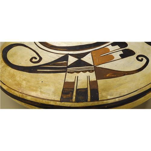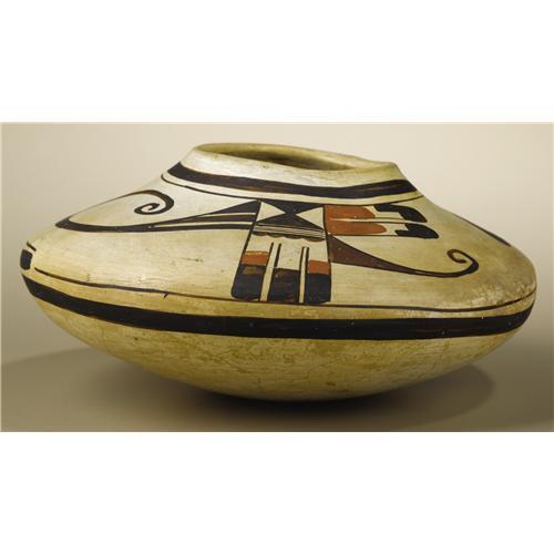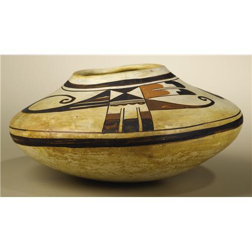<B>Hopi Polychrome Pottery Jar attributed to Nampeyo</B></I><BR>Circa 1900<BR>Height 4 1/2 in. Width 9 1/2 in.<BR><BR>The jar is characterized by its steeply tapering sides and small rounded shoulder. It is painted with a pair of abstract avian forms, each with a curving scroll beak and splayed feathers between wide framing bands. An eagle tail design was a favorite motif and Nampeyo continually reworked this design concept. "Nampeyo, the famous Hopi-Tewa potter (1860-1942) is known for the grace and beauty of her work…By the turn of the twentieth century, Nampeyo had revitalized Hopi pottery by creating a contemporary style inspired by prehistoric ceramics."1<BR><BR>Provenance<BR>Bonhams & Butterfields, Sale 7477E, Lot 3340, December 8, 2003.<BR>"The attribution to Nampeyo has been made by Martha Struever in an expertise gained through years of study and interest in Nampeyo's work and through personal contact with her descendants. In a letter referring to this jar she writes: 'The four color pottery jar can be attributed to Nampeyo based on several identifiable characteristics: the long swooping arcs ending in a simple scroll can be seen in illustrations of Nampeyo's work in <I>American Indian Art</B></I> magazine, Summer 1976, p. 26, figures 2 and 3, and p. 27; the use of the pair of feathers below the upper framing line; the general layout and form with slightly layered out-turned rim are often found in Nampeyo's pottery. An unusual feature of this vessel is the lower framing lines at the shoulder that overlap and do not join as the upper framing line does. Vessels of similar form and composition are exhibited at the Milwaukee Public Museum. (Photo #XE-482-13E, Milwaukee Public Museum.) <I>Nampeyo and Her Pottery,</B></I> Kramer, Barbara, University of New Mexico Press, p. 111.'" <BR><BR>References<BR>1Kramer, Barbara, <I>Nampeyo and Her Pottery,</B></I> University of New Mexico Press, Albuquerque, 1996, Dust jack