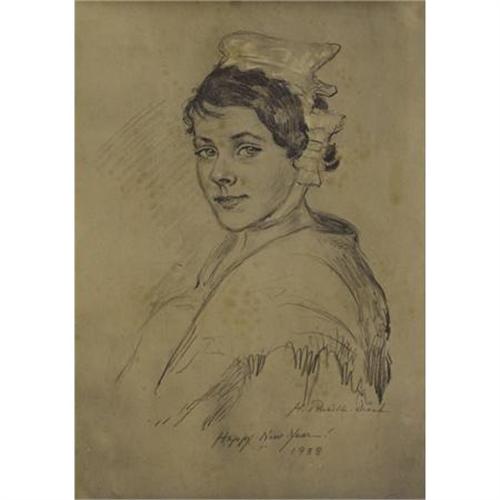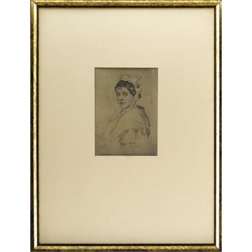 <B>Attributed to NATHANIEL J. POUSETTE-DART </B></I>(American 1886-1965)<BR><I>Portrait of a Young Woman</B></I>, 1938<BR>Pencil with white heightening on blue paper<BR>6 x 4-1/2 inches (15.2 x 11.4 cm)<BR> Signed and Inscribed lower right and lower center:<BR><I>H. Ponselle. Drach/ Happy New Year!/ 1938</B></I><BR><B>Condition Report:</B> Glued down to buff paper hinged to mat. Scattered, light foxing<BR><BR><b>Shipping:</b> Requires 3rd Party Shipping (<a target="_blank" href="http://www.heritageauctions.com/common/shipping.php">view shipping information</a>)