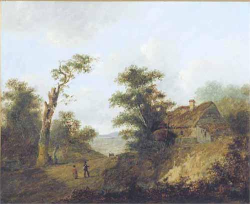 Attributed to Patrick Nasmyth (1787-1831) oil on board, Travellers and cottage in a landscape, 10 x 12 ins. £500-700