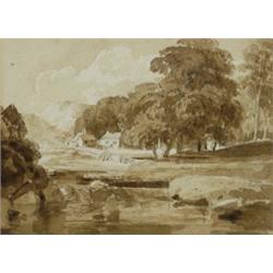 Attributed to Peter de Wint (1784 - 1849), Cottages And Pool, in a wooded landscape, sketch, pencil and sepia wash, 3.75in x 5.25in, verso with pasted letter and certificate, signed by Sir Geoffrey Harmsworth û this sepia sketch is the work of Peter de Wint, 1784-1849. It was removed from an album in which Mrs. de Wint had pasted many of her husbandÆs sketches. In due course the album came into the possession of the artistÆs granddaughter, Miss H. Tatlock. At Miss TatlockÆs death it passed to her life long friend and companion Miss Bostock from whom it was acquired by Sir Geoffrey Harmsworth. The latter presented the sketch to Mr. G. Q. Armitage, dated 14th March 1939. Press cutting pasted verso referring to ChristieÆs sale of pictures by de Wint, the property of the late Miss Grace Bostock of Winchester