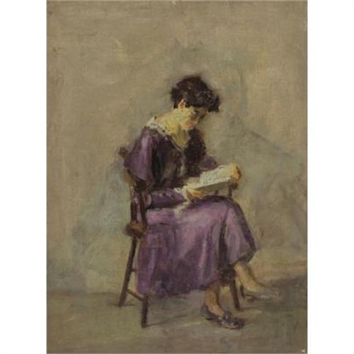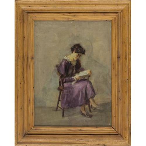 <B>Attributed to SUSAN MACDOWELL EAKINS (American, 1851-1938)</B></I><BR><I>Girl in a Purple Dress</B></I>, circa 1890<BR>Oil on canvas board<BR>16 x 12 inches (40.6 x 30.5 cm)<BR>Vestige of signature and date lower right<BR> <BR>Handwritten label verso: <I>Girl in purple dress painted by Mrs. S. M. Eakins</B></I><BR>Artist's materials label verso: <I>HENRY M. TAWS, Philadelphia</B></I>