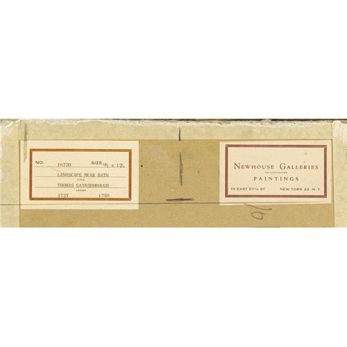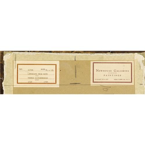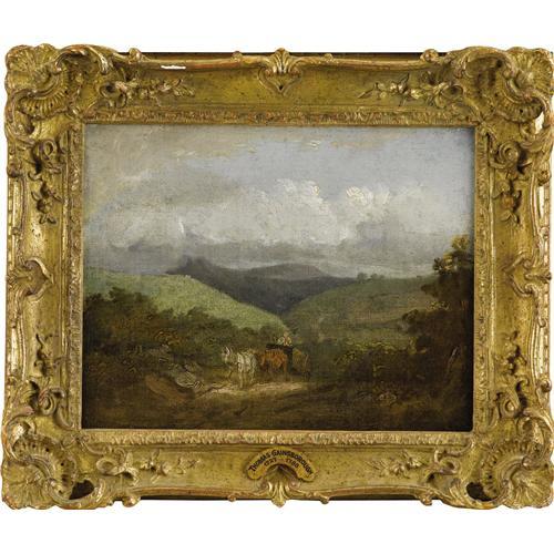 <B>Attributed to THOMAS GAINSBOROUGH</B></I> (British 1727-1788)<BR><I>The Waggoner: Landscape Near Bath</B></I><BR>Oil on canvas<BR>9-3/4 x 12 inches (24.8 x 30.5 cm)<BR>Signed with indecipherable inscription verso<BR><BR>Provenance:<BR>Newhouse Galleries (New York);<BR>Mr. and Mrs. F. Howard Walsh (Fort Worth, Texas);<BR>Walsh Family Art Trust<BR><BR> <B>Condition Report:</B> relined, cleaned, revarnished, craquelure throughout, scattered strengthening<BR><BR><b>Shipping:</b> Requires 3rd Party Shipping (<a target="_blank" href="http://www.heritageauctions.com/common/shipping.php">view shipping information</a>)