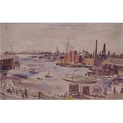 HARBOR SCENE, oil painting on canvas board, 10 x 16", signed lower right, overall surface soiling, scratches with loss of paint. $1000/2000
