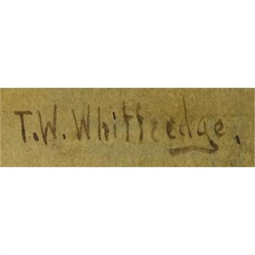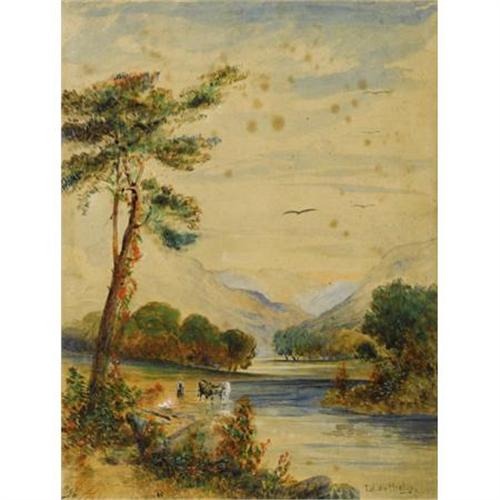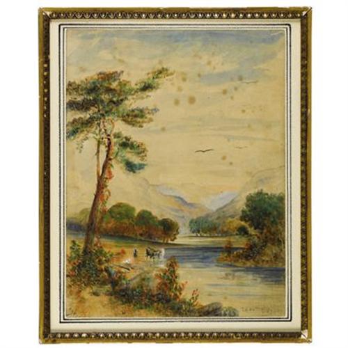 <B>Attributed to THOMAS WORTHINGTON WHITTREDGE (American, 1820-1910)</B></I><BR><I>River Landscape</B></I><BR>Watercolor on paper<BR>12-3/4 x 9-3/4 inches (32.4 x 24.8 cm)<BR>Signed lower right: <I>T.W. Whittredge</B></I><BR> <B>Condition Report:</B> Heavy foxing, toning. Not examined out of frame.<BR><BR><b>Shipping:</b> Framed - without Glass, Small (<a target="_blank" href="http://www.heritageauctions.com/common/shipping.php">view shipping information</a>)