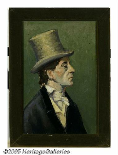<B>Attributed to WALT KUHN (American 1877-1949)</B></I><BR>Man in Top Hat<BR>Oil on canvasboard laid down on masonite<BR>9in. x 6in.<BR><BR>Condition Report: Inscribed reverse 'restored Dec. 6 - 75', canvasboard laid onto masonite, general surface yellowing from dirt and old varnish, otherwise very good condition.<BR><BR>Brian Roughton: Minor pin-point within inpainting.<BR>