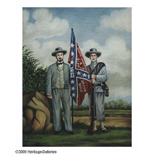 <B>Manner of WILLIAM AIKEN WALKER (American 1838-1921)</B></I><BR><I>Two Confederate Soldiers</B></I><BR>Oil on board<BR>10in.x 8in.<BR>Signed lower left: WA Walker<BR>1 <BR><BR><B>Condition Report:</B> fine horizontal cracklure across surface from expansion of panel, moderate dirt and yellowing of old varnish.