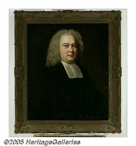 <B>Attributed to WILLIAM HOGARTH (British 1697-1764)</B></I><BR>Portrait of Rev. Curwen Hudleston<BR>Oil on canvas<BR>30.5in. x 25in.<BR>Label on reverse inscribed 'The Rev'd Curwen Hudleston of Whitehaven, Cumberland, Second son of Andrew Hudleston, Esq. of Hutton: John'<BR><BR>Condition Report: Old lining, craquelure throughout, evidence of overcleaning in lower areas, extensive overpainting in background areas, left tab of collar and wig area; finely detailed inpainting in face of figure, surface covered with thick shiny new varnish.<BR><BR>Brian Roughton: I would have trouble attributing to Hogarth. Very poor condition.<BR><BR>HGA: several letters supporting the attribution and lineage of the sitter will accompany the lot.