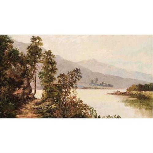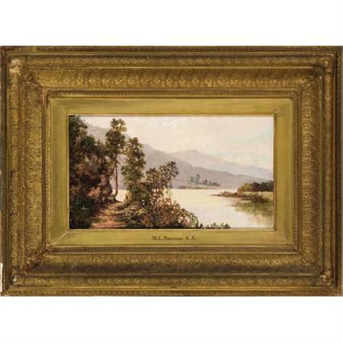 <B>Attributed to WILLIAM LOUIS SONNTAG (American, 1822-1900)</B></I><BR><I>Mountain Landscape with Lake</B></I><BR>Oil on board<BR>6-1/2 x 11-3/4 inches (16.5 x 29.8 cm)<BR><BR> <B>Condition Report:</B> Very good condition.<BR><BR><b>Shipping:</b> Framed - without Glass, Small (<a target="_blank" href="http://www.heritageauctions.com/common/shipping.php">view shipping information</a>)