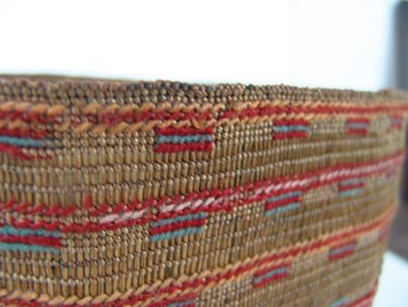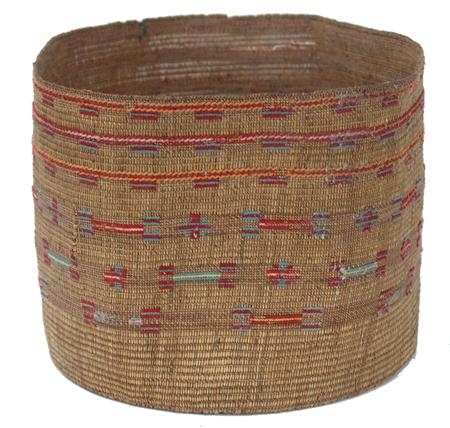 Circa 1900, Larger extra-fine weave cylinder basket with bands of designs done with fine woolen and Russian silk thread. Very good condition, minor repairs. Ex: Frank Curley collection. 7-1/2" x 9-1/2"