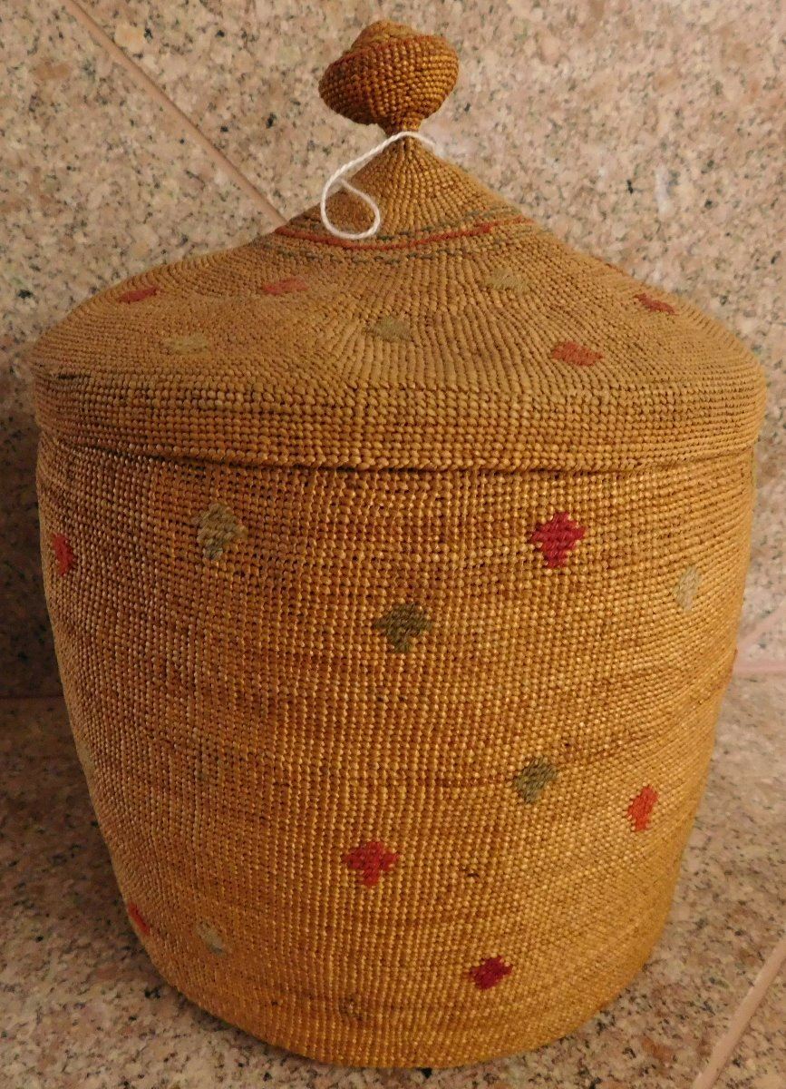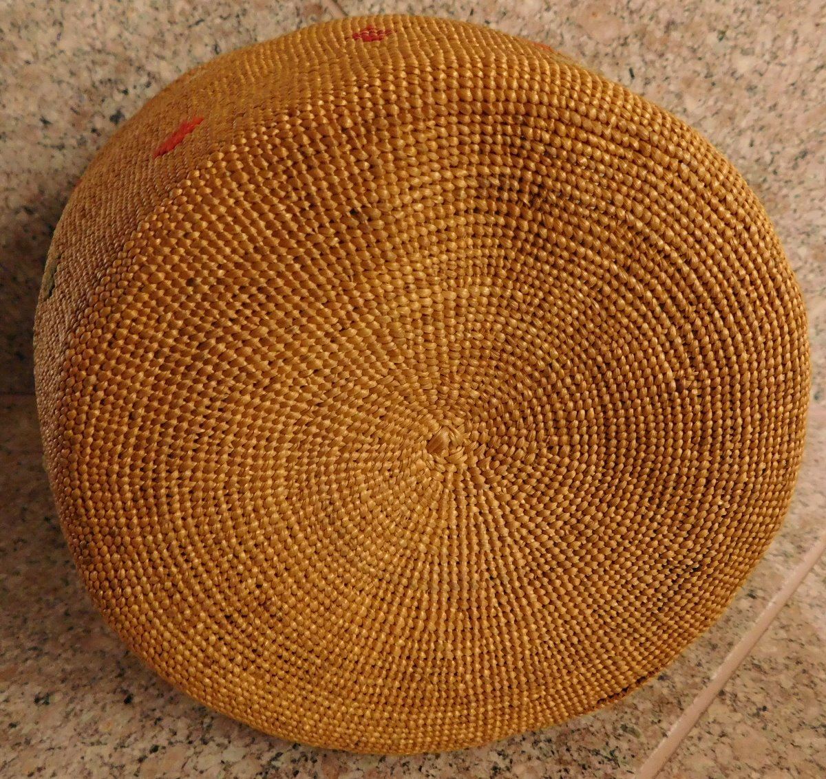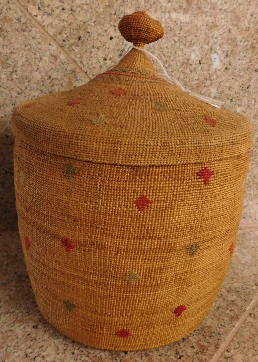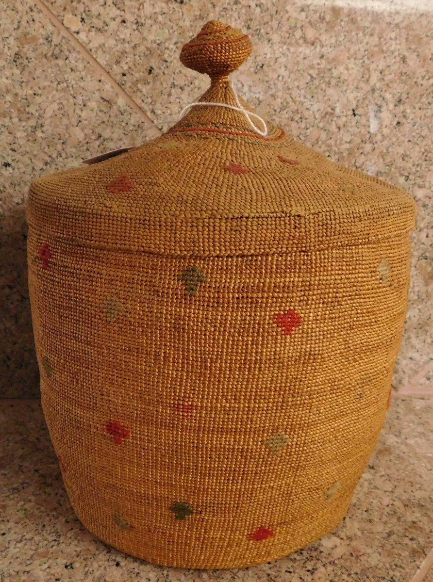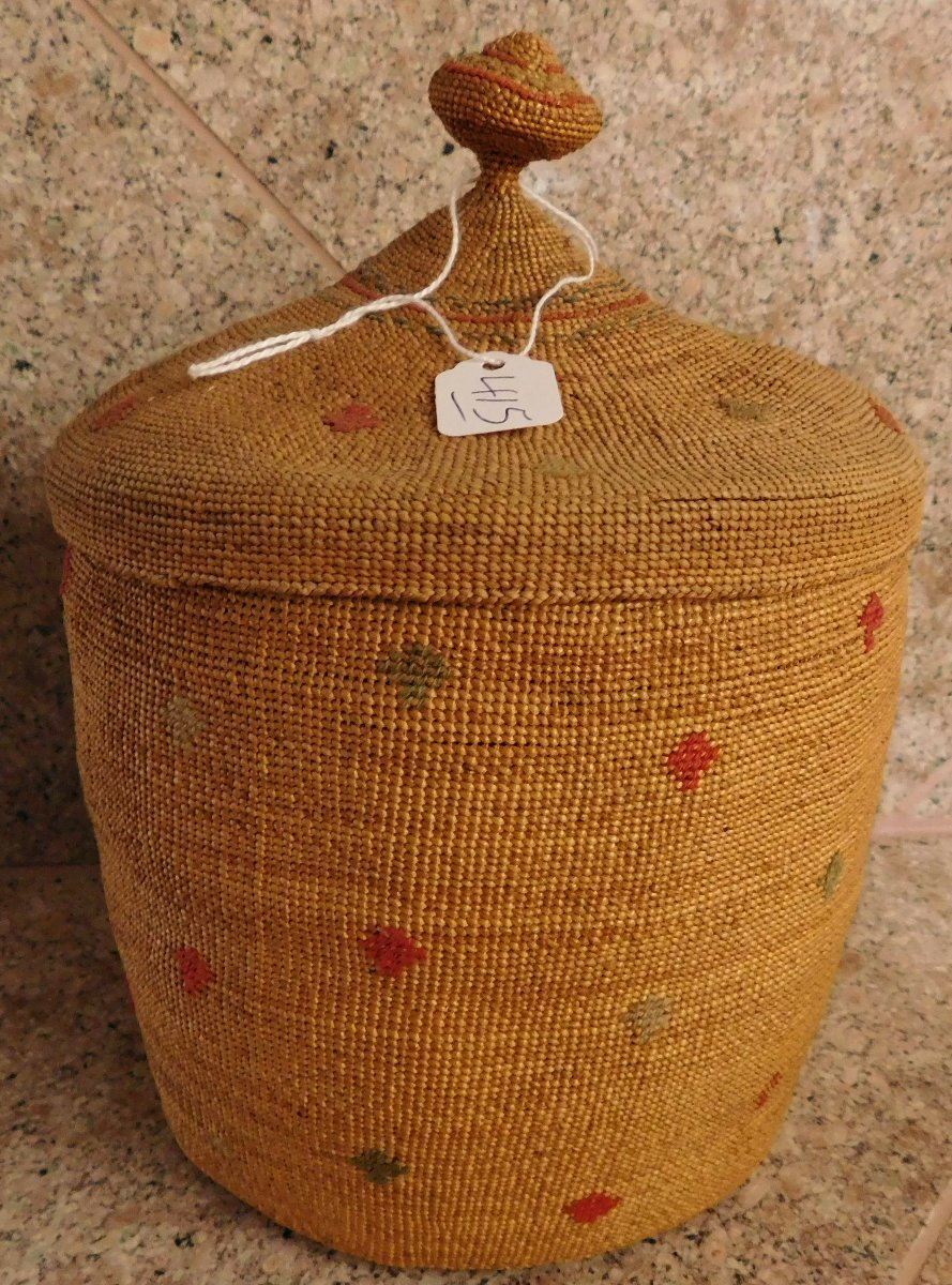 Attu Lidded Eskimo Basket, circa 1930s. Made of grass and yarn decoration, the item is 9" x 7". Alaska. Red and green design. Condition: Very good, see images. Shipping: $55.00 w/insurance and signature, double-boxed, due to value.