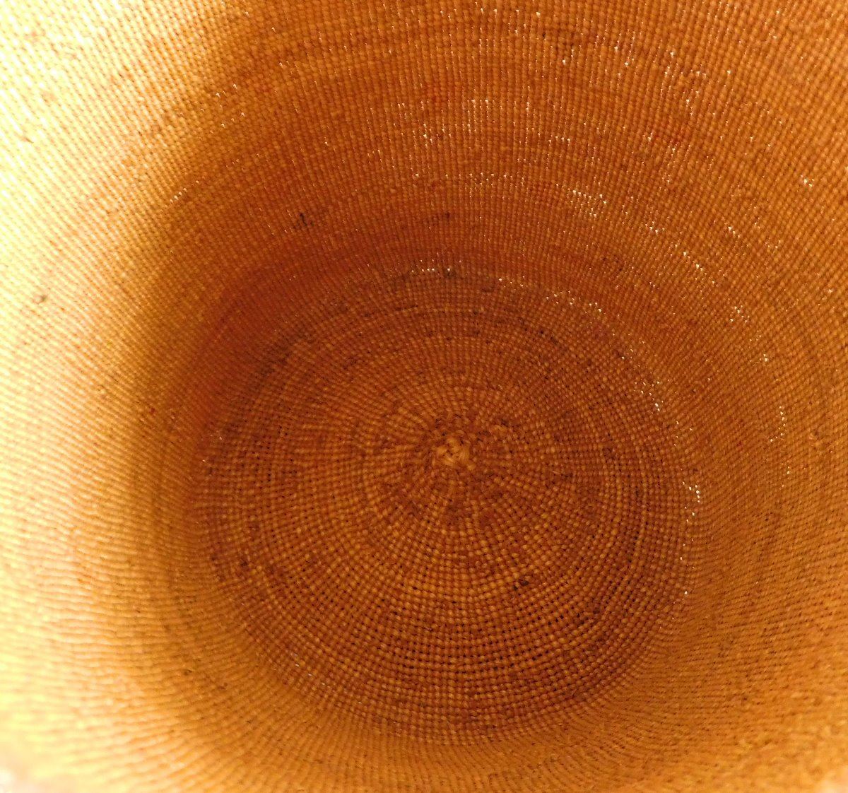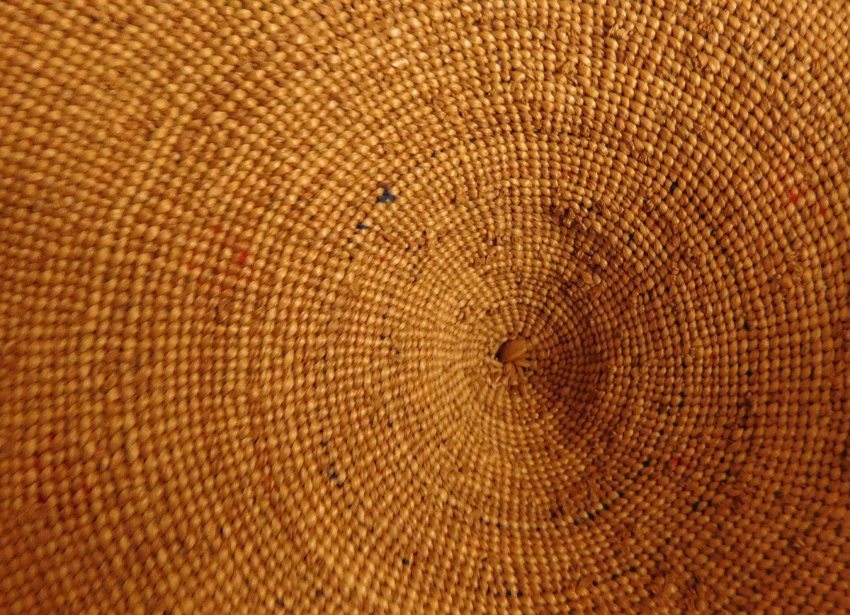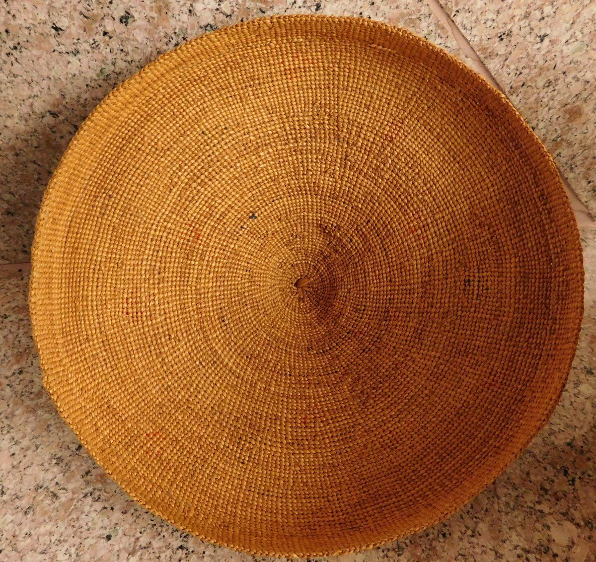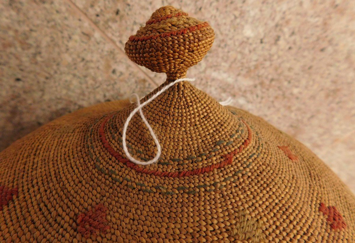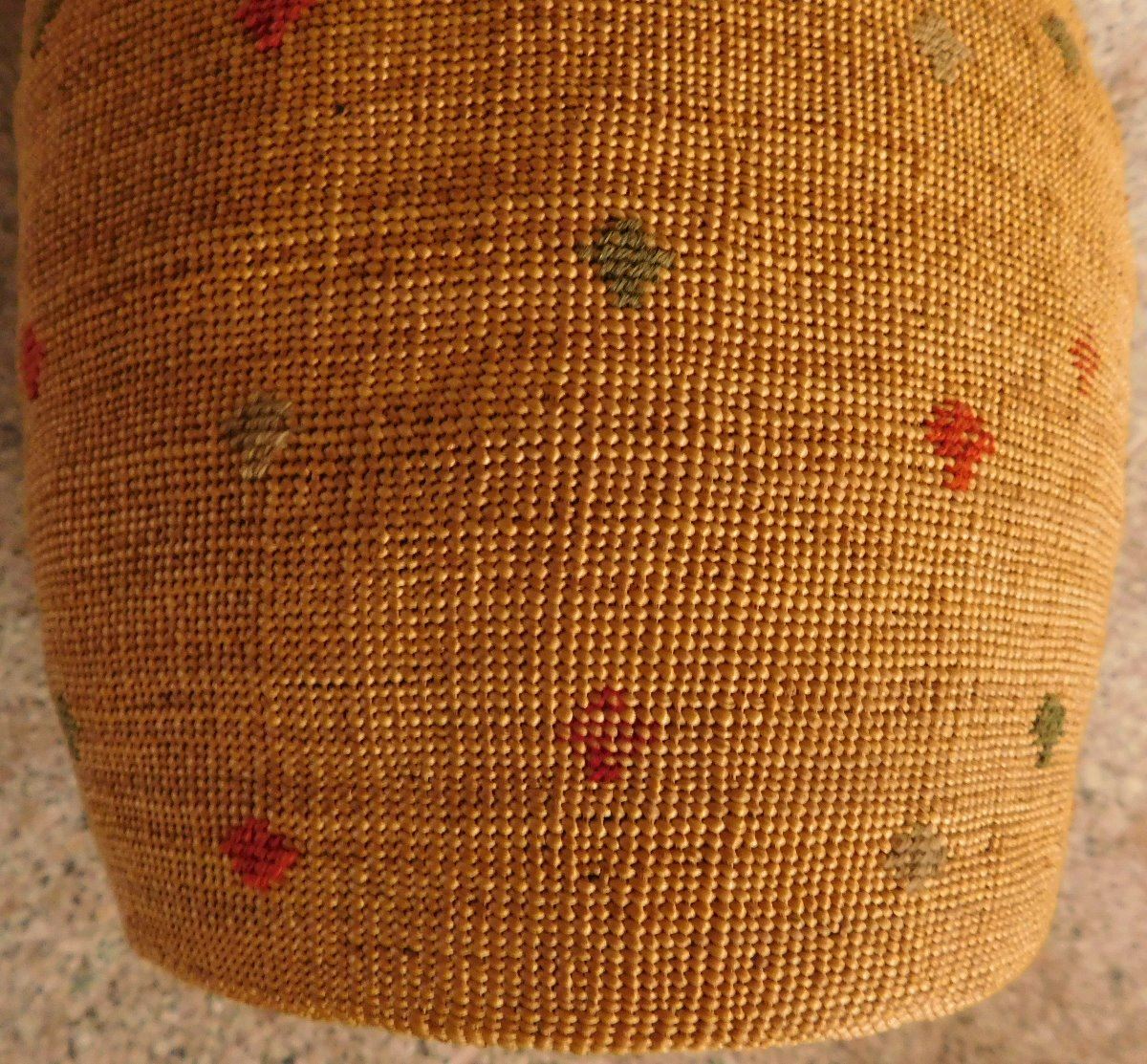 Attu Lidded Eskimo Basket, circa 1930s. Made of grass and yarn decoration, the item is 9" x 7". Alaska. Red and green design. Condition: Very good, see images. Shipping: $55.00 w/insurance and signature, double-boxed, due to value.