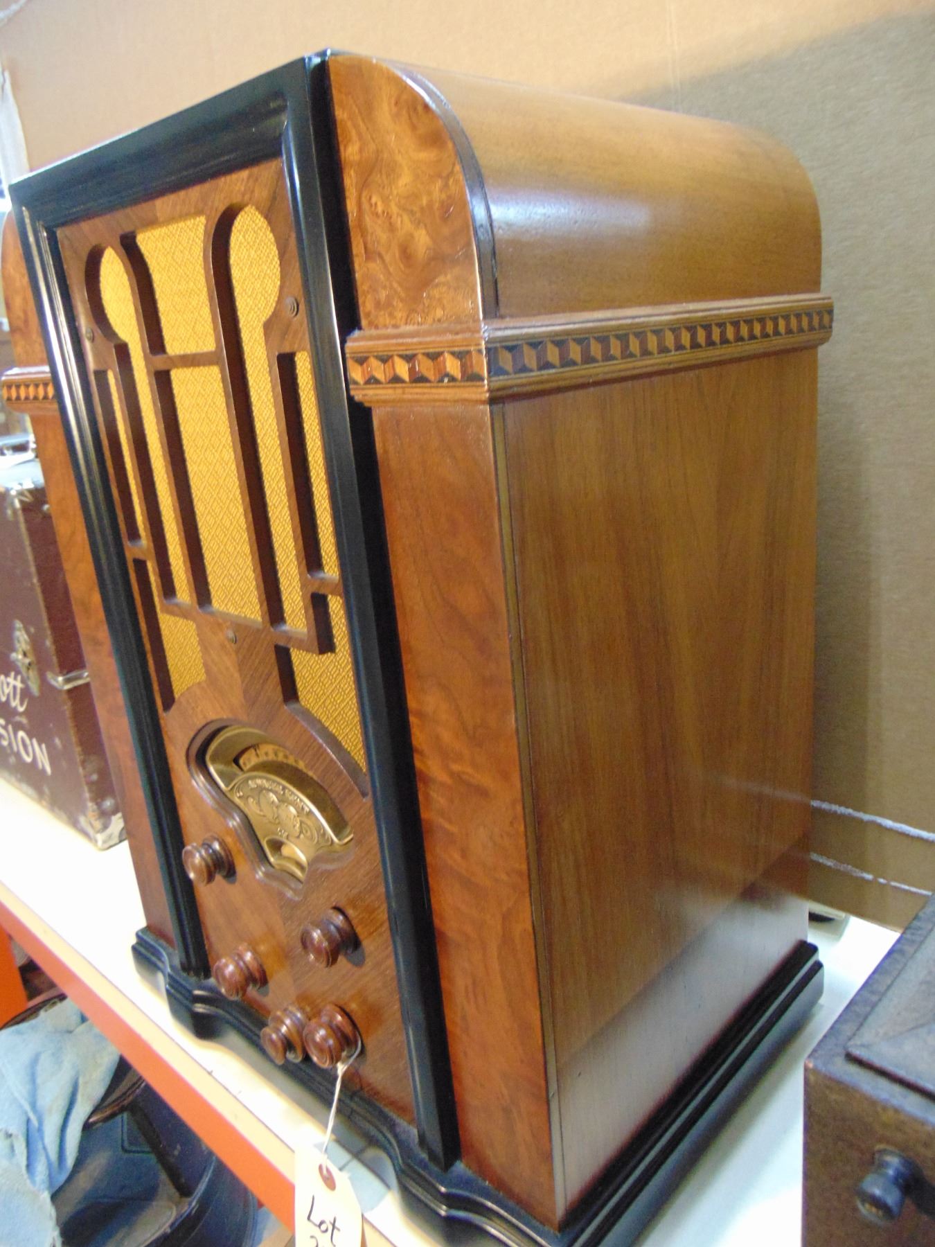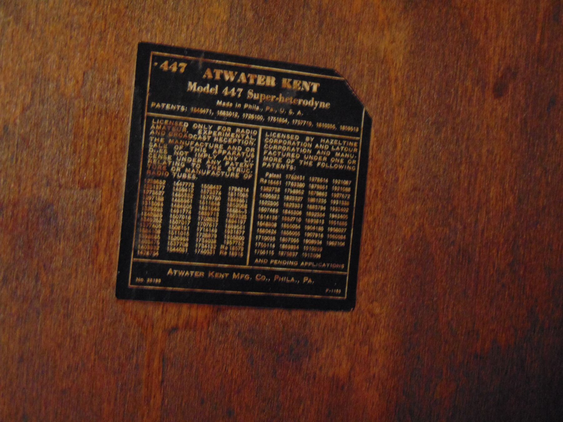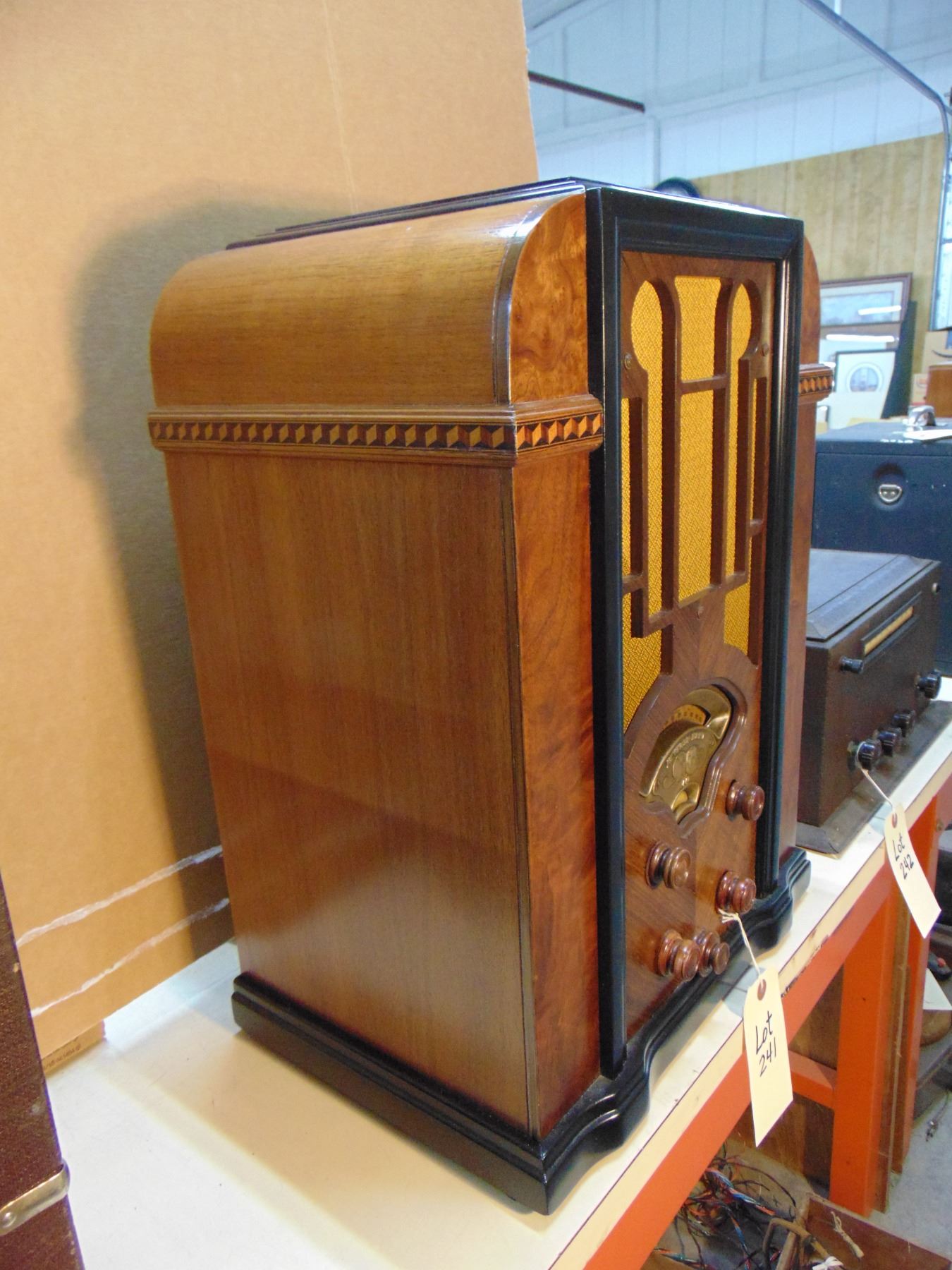 Atwater Kent large tombstone model 447; this radio is fully restored inside and out. Extremely nice and rare radio; You would expect it to work, and it does! Also, the side views of this radios show horizontal lines...they are the reflection from the radio sitting next to it on each side. This is an excellent refinish job.
