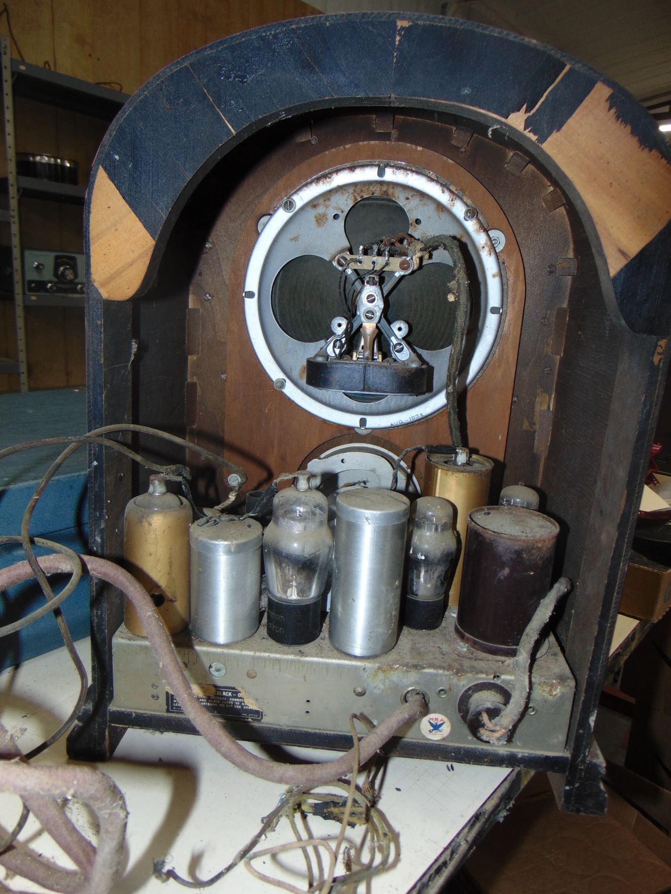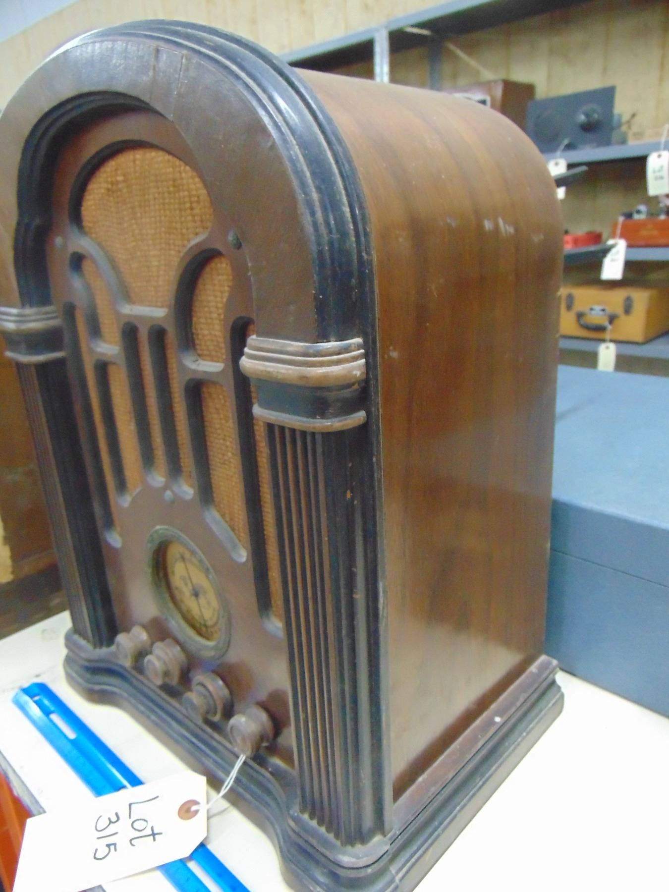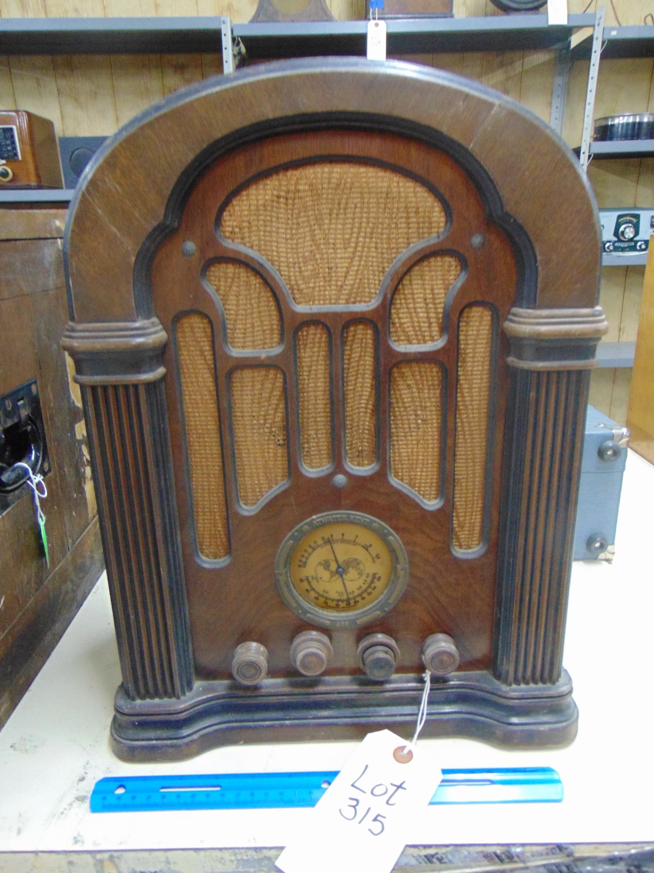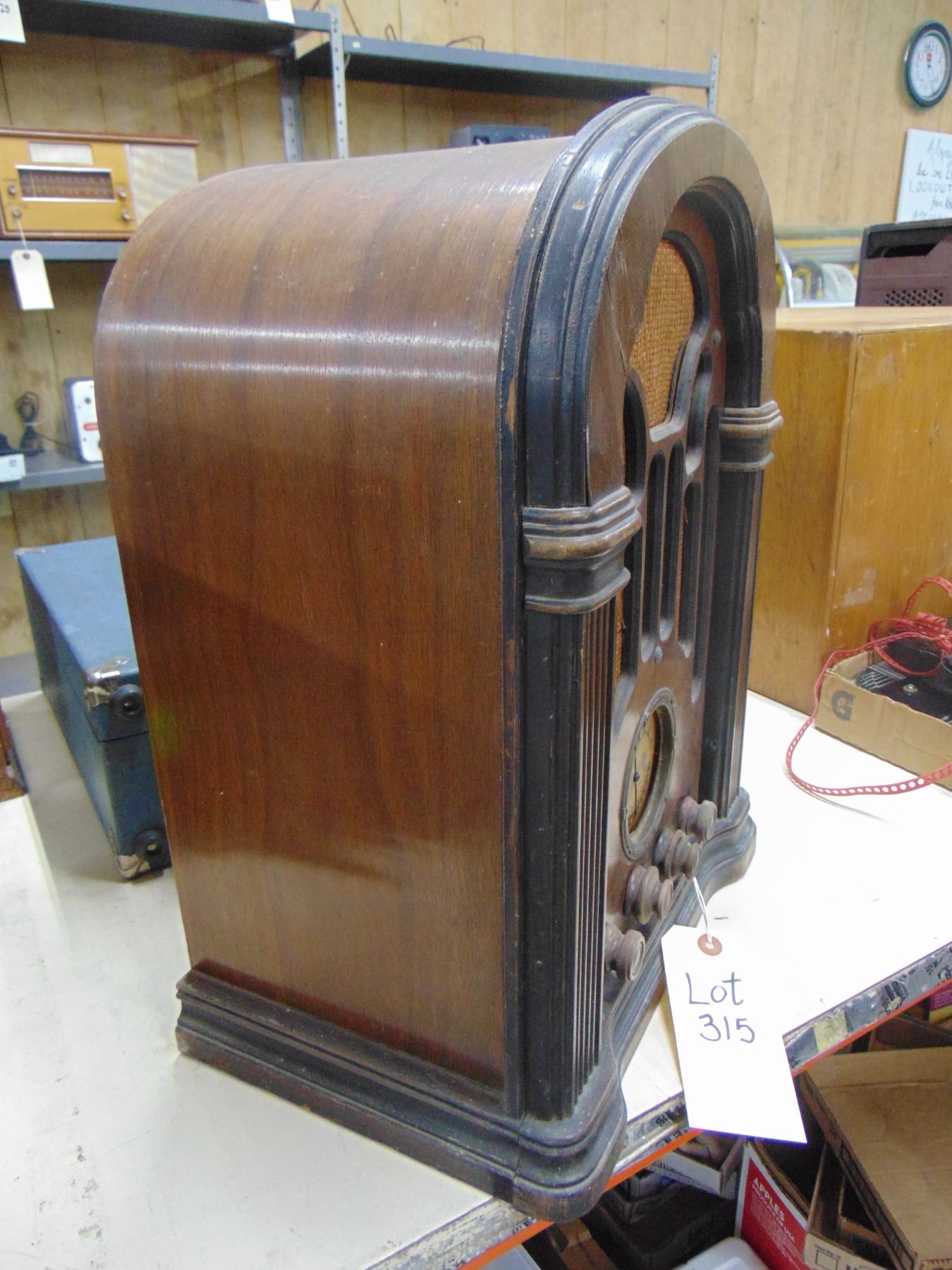 Large wood cathedral; battery; model 465Q; nice; missing plastic dial cover