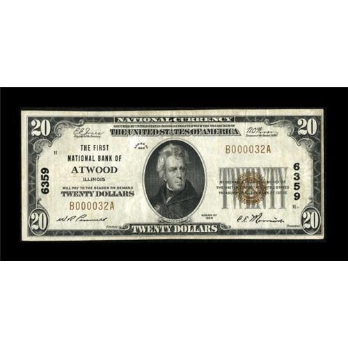 <B>Atwood, IL</B></I> - $20 1929 Ty. 1 <B>The First NB</B></I> Ch. # 6359<BR> A very scarce serial number 32 note from the only bank chartered in this small community. Only Type ones were issued in small size, with just a literal handful recorded in the Kelly census. Nice <B>Fine-Very Fine</B></I>.<BR><BR><b>Shipping:</b> Coins & Currency (<a target="_blank" href="http://www.heritageauctions.com/common/shipping.php">view shipping information</a>)
