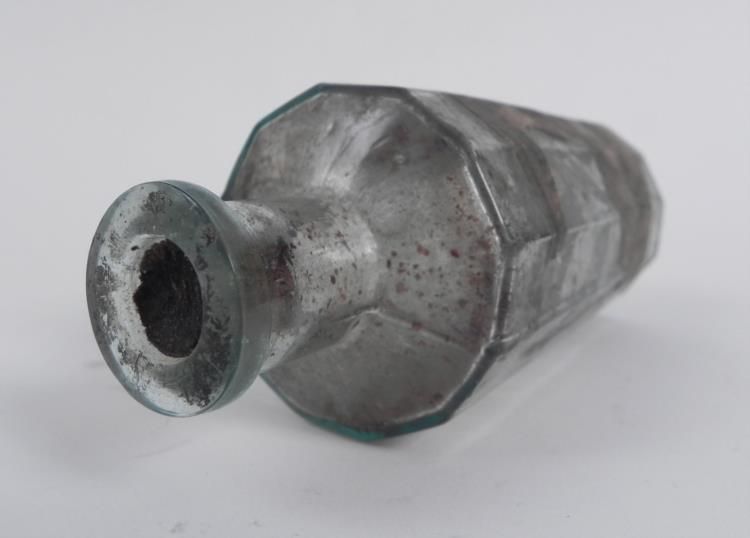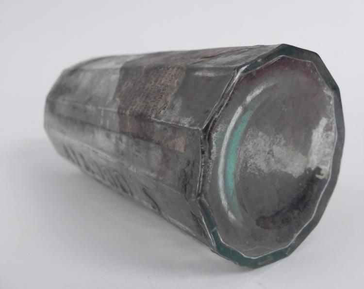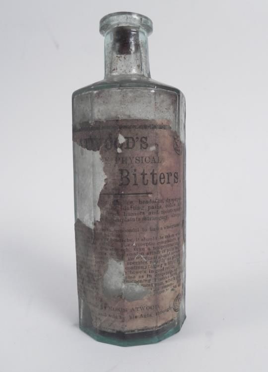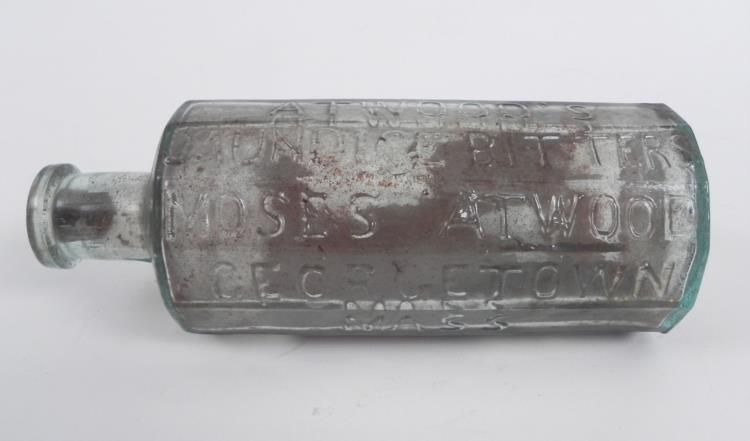 What makes this Atwoods Jaundice Bitters medicine bottle extra special is that it retains most of its original paper label on back. There is also a portion of cork at the neck. The body and shoulder of the bottle are 12 sided. The raised lettering is very visible. The label has part of the name, and an explanation of its medicinal properties. The dimensions are 6 x 2 1/4 inches. * * Moses Atwood of Georgetown Massachusetts became well known for his bitters, and a New York City firm bought his special formula to produce under different names. This is a fine, original example of Atwood's Jaundice bitters.