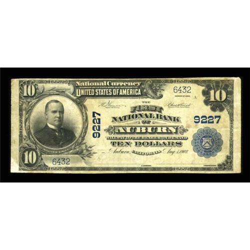 <B>Auburn, CA</B></I> - $10 1902 Plain Back Fr. 626 <B>The First NB</B></I> Ch. # 9227<BR> A truly rare note from a Placer County bank which issued large examples only. After an offering on a Hickman and Waters price list in 1968, thirty six years passed before the collecting fraternity was given another chance to obtain any note from this one bank location at public sale in our Horwedel auction, where a Fine-Very Fine piece realized $15,525 against a pre-sale estimate of $8,000-12,000. The note we now offer is a virtual duplicate in grade to the Horwedel specimen, and has been off the market for almost four decades. It is one of the best notes in a simply spectacular California offering, and is likely to realize a sum similar to that reached almost four years ago. <B>Fine+++.</B></I><BR><I>From The Kansas City Collection.</B></I><BR><BR><b>Shipping:</b> Coins & Currency (<a target="_blank" href="http://www.heritageauctions.com/common/shipping.php">view shipping information</a>)