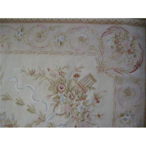 This Charming Ivory color and pastel, 3 tone red, (terra cota-bronze) soft sage/olive and gold colors wool Aubusson rug, is handmade and hand knotted. It is from China, with label attached descriptive.This rug is brand new and never been used. This very large and gorgious rug was acquired for decorative purposes.It belongs to dear friend of ours. It is by Sail. (image of a sail boat). it is numbered on the tag 11002264. 83.43 SQ. Ft. YsA109. 100% wool Aubusson Carpet - 3.14x2.47 MT- -7.75 MT. - 10.30x8.10 FT. it is beautiful with soft decorative colors!
