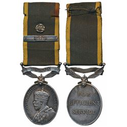 Efficiency Medal, George V, Silver, India written on a foliated bar, awarded to PTE. E ROZARIO 2nd Battalion East India Railway Regiment Auxiliary Fo