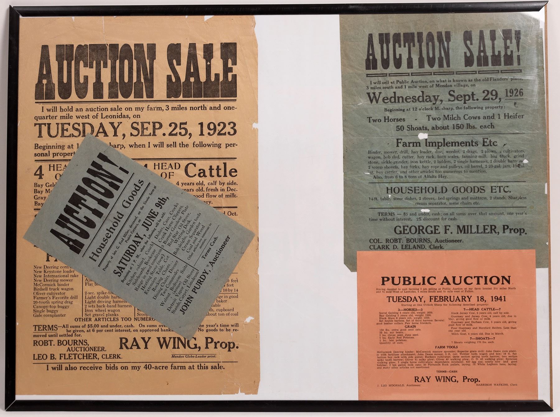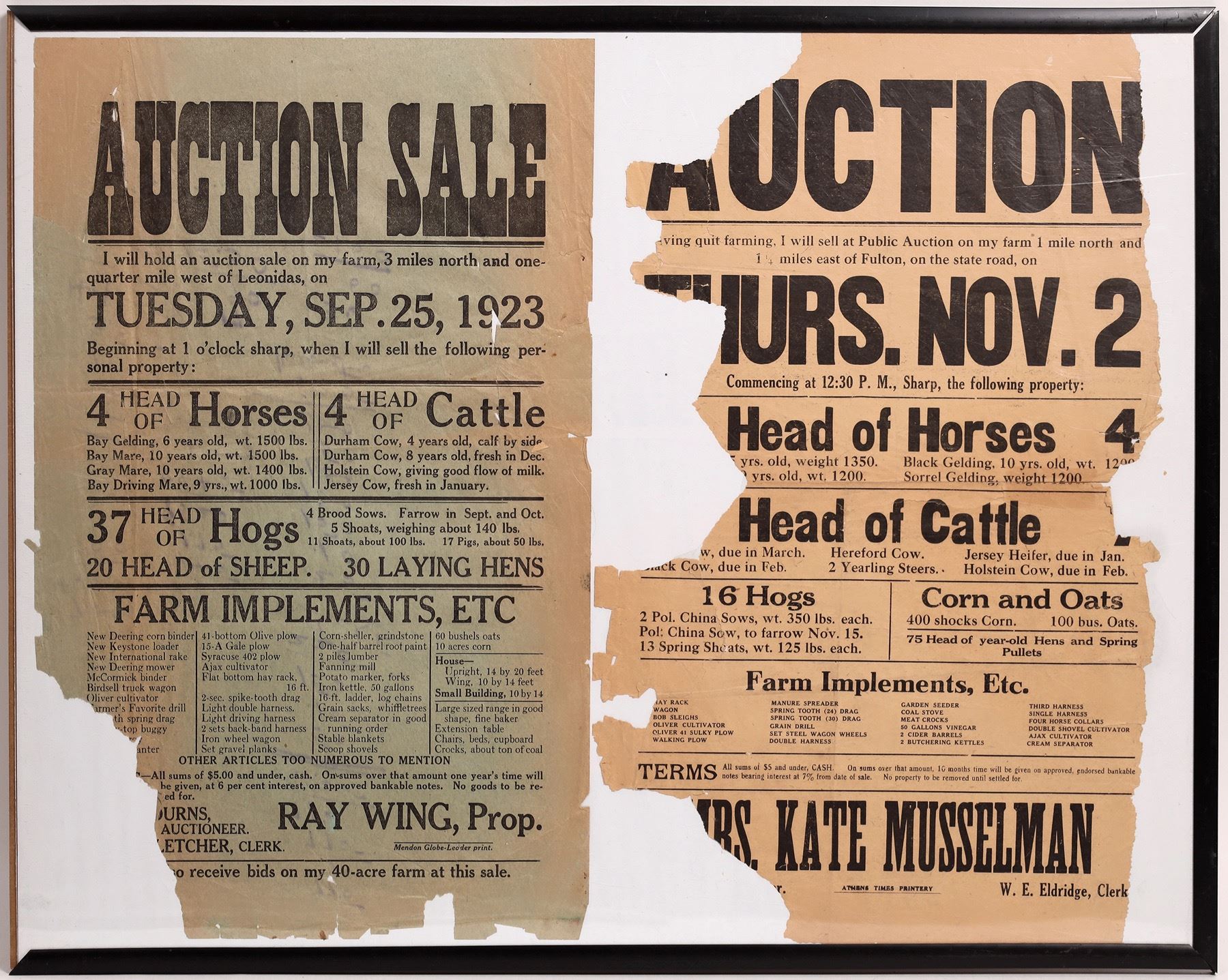 C) Frame with four broadsides for auctions of live stock, grain, farm equipment, and household goods. These broadsides are from 1923, 1926, and 1941. They are varying sizes, in a 23.75 x 17.75 frame, frame is missing the right edge. City: State: Date: 1920s, 1940s