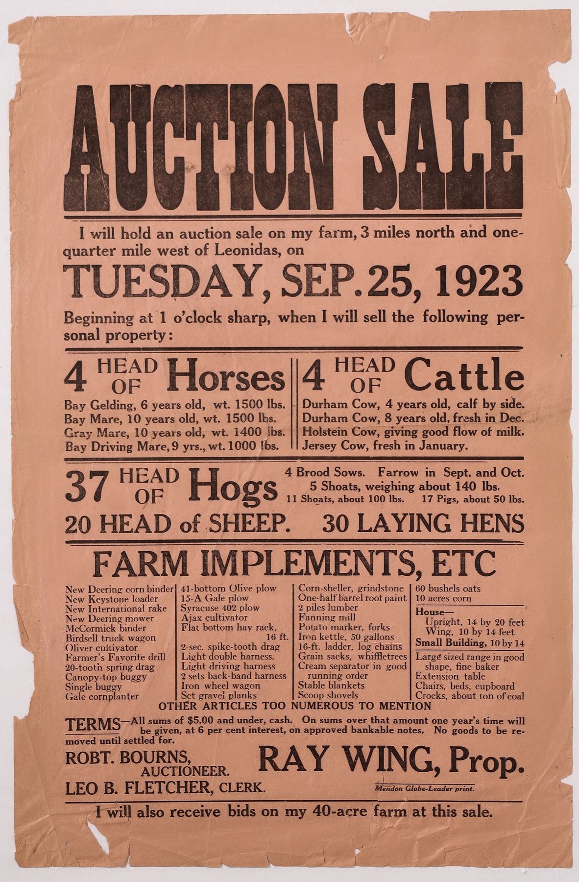 A) Framed broadside for a live stock and farming equipment auction held on September 25, 1923. This broadside was printed by the Mendon Globe-Leader, a newspaper in Michigan. Broadside is 16.75 x 11 in a 23.75 x 17.75 frame. Good condition, bottom and side edges of the frame are missing.