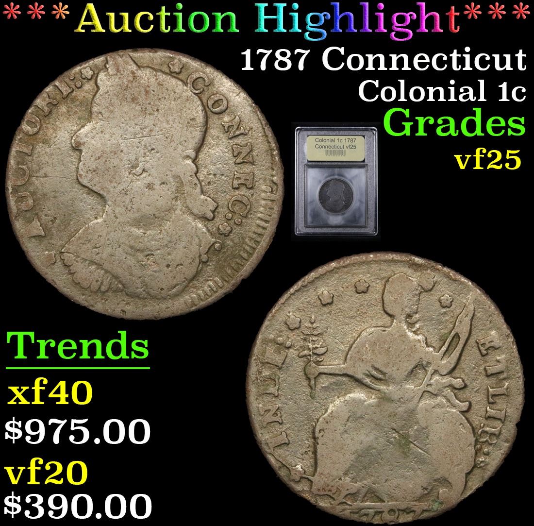 ***Auction Highlight*** 1787 Connecticut . . Colonial Cent 1c Graded vf+ By USCG. A Corey's Pick