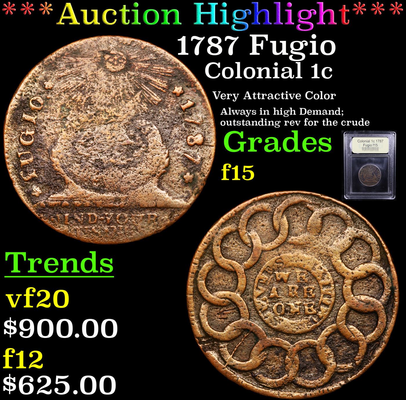 ***Auction Highlight*** 1787 Fugio Colonial Cent 1c Graded f+ By USCG. A Corey's Pick, Bid to Win Coin